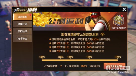 福利二、每天1块钱,公测返利High到爆,最高返利180%! 活动时间: 测试期间内 活动规则: 1、测试期间充值任意金额,即可享受公测返还对应金额的120%的蓝钻返还; 2、测试期间连续3天每天充值≥1元,即可享受公测返还比130%的蓝钻返还; 3、测试期间连续5天每天充值≥1元,即可享受公测返还比150%的蓝钻返还; 4、测试期间连续7天每天充值≥1元,即可享受公测返还比180%的蓝钻返还; 奖励说明(非常重要,请认真阅读): 1、公测时领取蓝钻返还奖励需使用与本次测试同一账号登录游戏; 2、必须进入公测1服,并且使用首个创建的角色,前往指定NPC处领取返还,一旦领取过返还奖励后同一账号下其他角色将不可再领取; 3、公测返还的蓝钻不会激活公测时的首充奖励以及其他充值活动奖励,但会保留付费测时实际充值金额的对应vip进度,享受vip特权及vip等级奖励; 4、例:如本次测试过程中仅在10月26日当日累计充值达到100元,未满足任何连续充值天数,则在公测时将获得1200蓝钻返还及充值100元对应的vip进度;若本次测试过程中连续七天每天均累计充值100元共700元,则在公测时将获得12600蓝钻返还及充值700元对应的vip进度。 活动展示:
