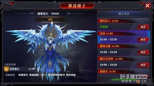 木有看懂的参照下表,比如说: 01级进入勇者大陆:骷髅王 16:00 30级进入仙踪林:魔石巨人 16:30 60级进入冰风谷:冰 后 17:00 90级进入地下城:玫瑰戈登 17:30 120级进入失落之城:魔王巴洛克 18:00