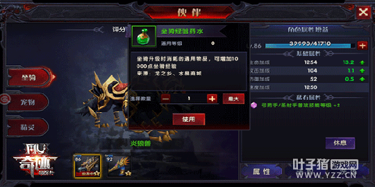点击右上角,角色属性增益下方经验值加号,可以对坐骑进行升级,升级后可以增加基础属性,并可以在西方查看稀有属性,选择适合个人职业的坐骑。