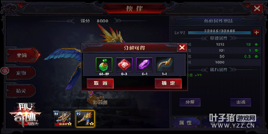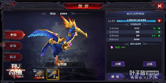 在坐骑界面,点击右下角按钮,可以选择,分解、出战、休息。