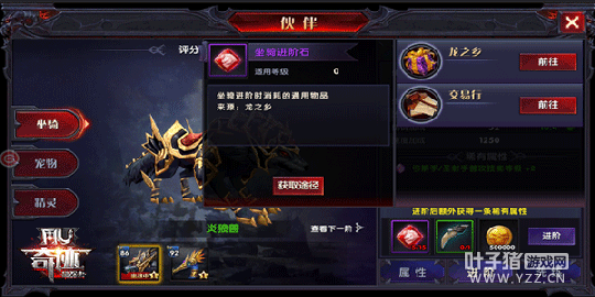 点击下方进阶按钮,集齐所需材料,即可进阶坐骑,进阶后坐骑外形会发生变化,点击材料部分可以查看材料获取来源。
