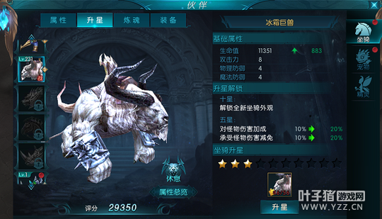 升星 玩家可以在该界面查看升星属性或者对坐骑进行升星操作。升星消耗该坐骑的碎片,星级越大消耗的碎片也就越多,不过升星都是没有失败几率的。达到十星之后坐骑还会解锁新的外观,非常炫酷。