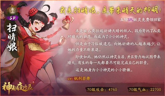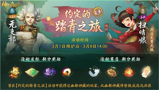 经典复刻 强力扫晴娘免费领3月1日,《神都夜行录》已经正式上线复刻活动“约定的踏青之旅”!在活动期间,当降妖师们完成踏青活动剧情,就可以免费获得活动限定SR妖灵“扫晴娘”。并且在完成每日小目标后,还可以累计获得2枚玉璧和6枚唤灵符等重磅福利。