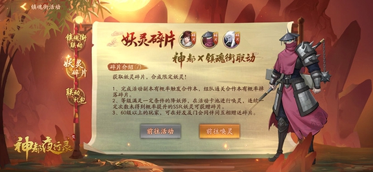 海量福利 重磅联动进行中由于IP版权原因,在联动活动全部结束后,降妖师们将无法获得于禁、曹焱兵等联动角色。为了让玩家们更加轻松的获得他们,除了可以通过“镇魂街联动”纪念卡池中召唤之外,半周年庆·第二期活动还提供可以通过碎片合成的方式,所需的妖灵碎片可以从卡池、妖灵收集福利、赠送、合作本、镇魂街活动商店等渠道获得。