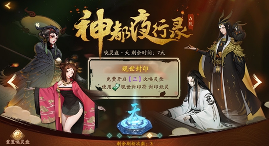 每月降妖师们可使用“唤灵盘·天”进行至多3次AR现世召唤,免费打开唤灵盘后即可进行妖灵封印。1张现世封印符可使用5枚付费玉璧进行购买,消耗1张现世封印符还可以获得1张剧情唤灵符!