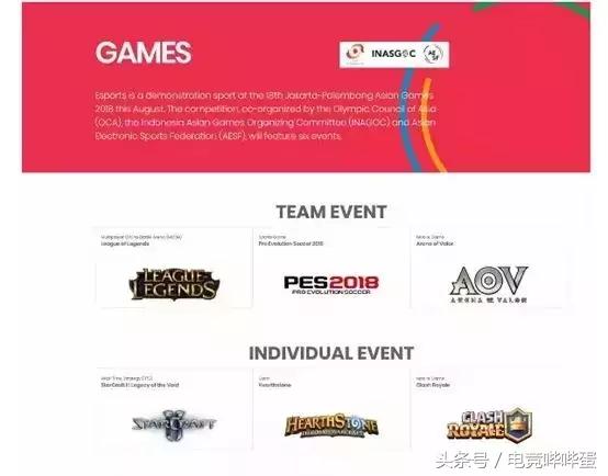 今年的雅加达亚运会电子体育共有6款游戏入榜。分别为《英雄联盟》、《Arena ofValor》(王者荣耀国际版)、《皇室战争》、《炉石传说》、《实况足球》和《星际争霸2》,它们将成为第18届雅加达亚运会表演项目。