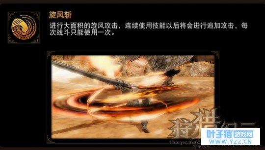 定位:近程战士 背景:擅长追捕和打猎的夜行者,具有丰富的自热知识和生存能力,坚韧与不屈服是猎刃的信念。 职业特点:战士可以作为无比坚固的防御型盾牌堡垒,也可以作为一个无坚不摧的高伤害近战职业,或是两者的集合。他们的能力很明显属于攻防兼备的近战艺术的范畴;在不同的情形和队伍组成情况下,他们所表现的姿势总是不同的策略。 猎刃技能介绍: 旋风斩: 进行大面积的旋风攻击,连续使用技能以后将会进行追加攻击,每次战斗只能使用一次(使用技能需要6点资源)