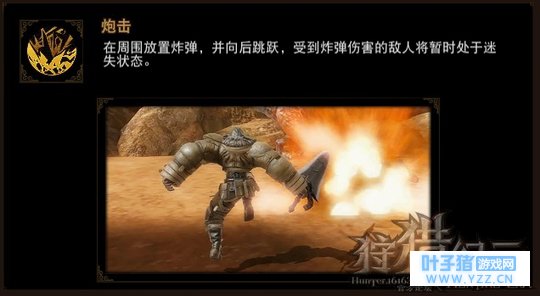 (旋风斩效果) 炮击: 原地放置炸弹以后迅速向后移动,被炸到的敌人将收到爆炸伤害,并且减少防御力,持续一段时间。(使用技能需要3点资源)