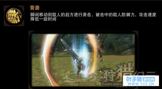 (猛击效果) 背袭: 瞬间移动到敌人的后方进行袭击,被击中的敌人防御力,攻击速度降低一段时间