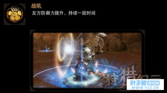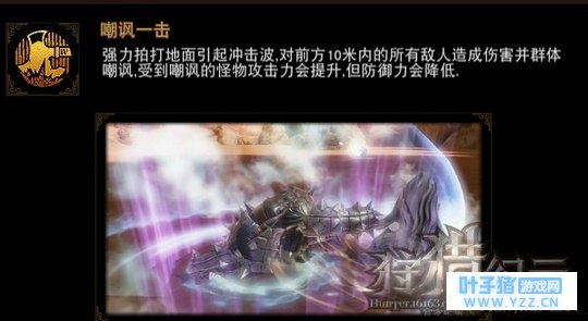 (战吼效果) 嘲讽一击:强力拍打地面引起冲击波,对前方10米内的所有敌人造成伤害并群体嘲讽,受到嘲讽的怪物攻击力会提升,但防御力会降低(使用技能需要3点资源)