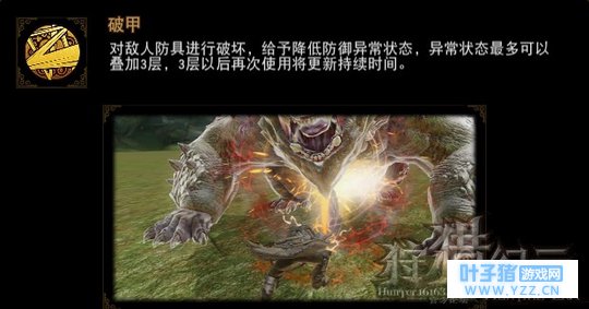 (嘲讽效果) 破甲:对敌人防具进行破坏,给予降低防御异常状态,异常状态最多可以叠加3层,3层以后再次使用将更新持续时间。