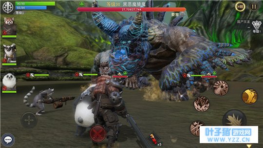 图三:可爱的炮手 伙伴来搭配,厮杀也不累 初入巨兽世界,很多玩家在与巨兽的战斗中都遇到了困难。此时,你便需要伙伴的帮助!《狩猎纪元》中,玩家将以1+3的形式,携带3位伙伴登场挑战BOSS。 系统为玩家配备了4位伙伴,它们都是格外可爱的萌物——浣熊、小熊猫、狐猴和国宝滚滚!可别因为它们的外表而轻视其战力,在初期它们的杀伤力可往往比玩家的角色还要高哦!这是因为新手玩家在技能释放和攻击节奏把控上的能力还比较有限,随着娴熟度的提高,自然杀伤力便能逐步增长!
