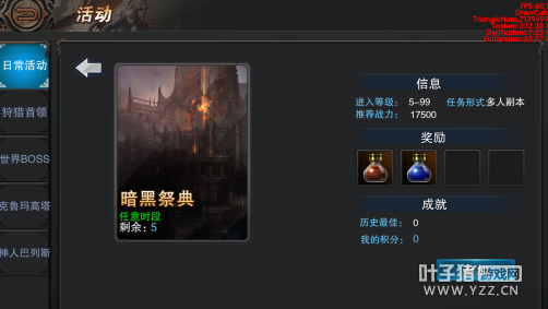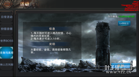 A. 一座传说没有尽头的高塔。 B. 玩家进入无尽之塔,开始从第一层开始向上进发,每一层都有很多的守塔怪 ,只有击杀所有怪物,才可以登向上一层。当然每完成一层登塔,就可以获得相应的奖励。 6. 黑暗祭典玩法