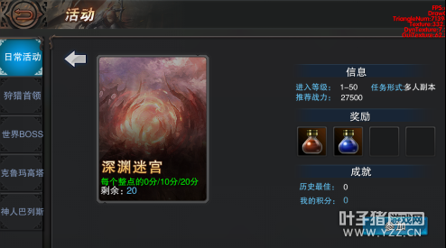 A. 任意时间段,玩家都可以组队进入黑暗祭奠中进行历练。 B. 黑暗祭典中有着无穷无尽的怪物,规定时间内,击杀的怪物越多,获得的积分也就越多。每日积分最多的一队玩家可以获得丰厚的奖励。 C. 不但奖励丰厚,万千万家中脱引而出,荣登榜首,本来就是一种荣耀。 7. 深渊迷宫玩法