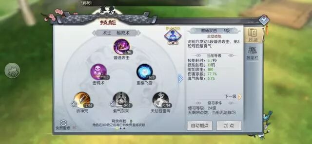三、 天劫 这个技能很纠结。 加天劫主要是针对伤害比较低的玩家, 当其他群体技能都用完了, 一波小怪还没秒掉的玩家 可以按上图加天劫, 其他玩家可以选择加 紫气东来 提战力 或者 重楼 提伤害。