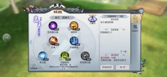 在这里提前先说一下, 如果只想要战力的朋友, 把被动技能全加满就行了, 不需要过来看怎么加点, 还有一点就是 平A可以回蓝 , (平A就是普通攻击哈~) 11级紫气东来增加蓝上限大概3000多点, 11级平A回7.6%的蓝, 以我11.7万蓝量为例: 平A3次可以回8892的蓝, 所以决定是否缺蓝并不是蓝上限有多高, 而是回复有多快。 下面分享我的蛊王加点方式: