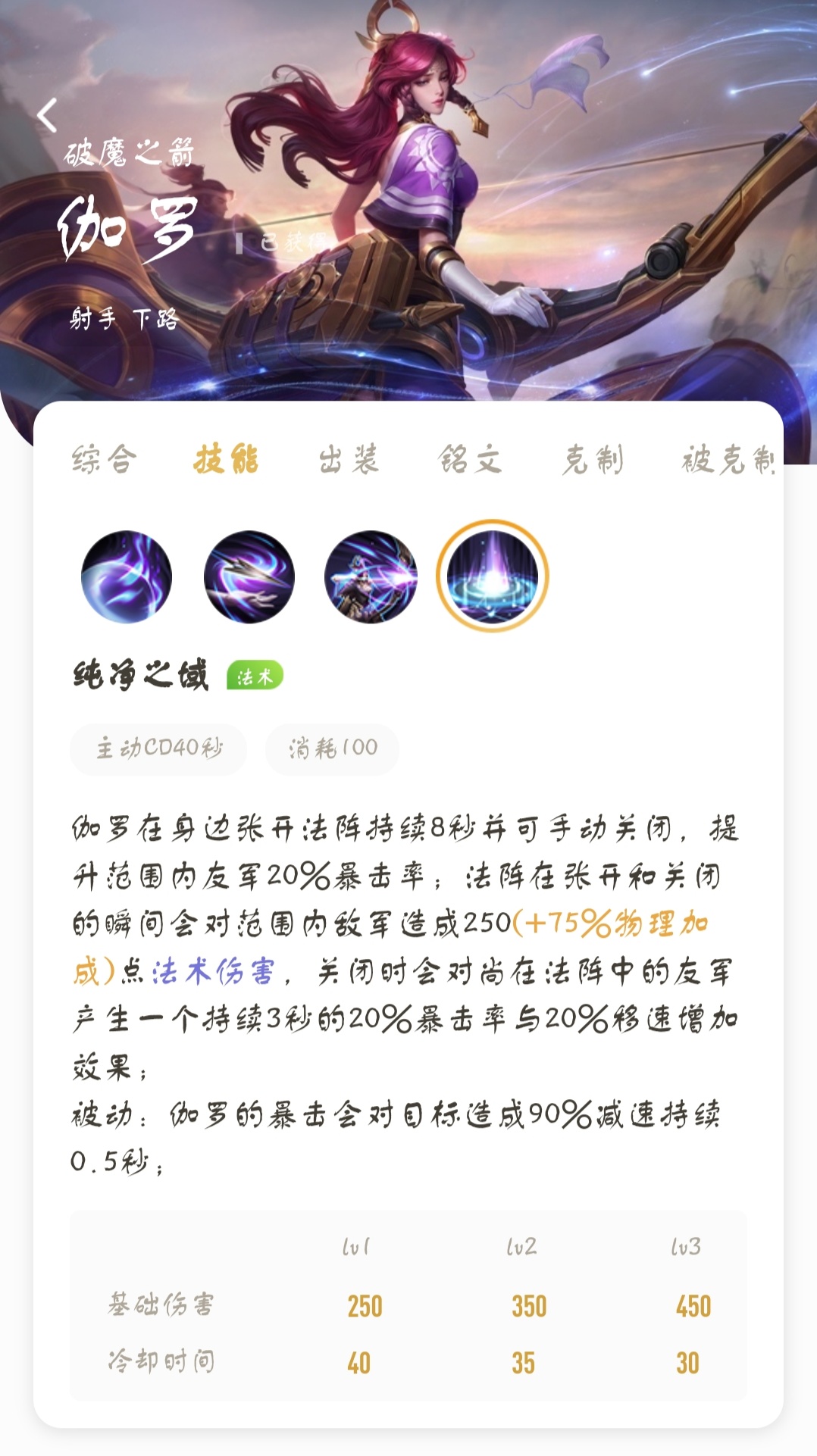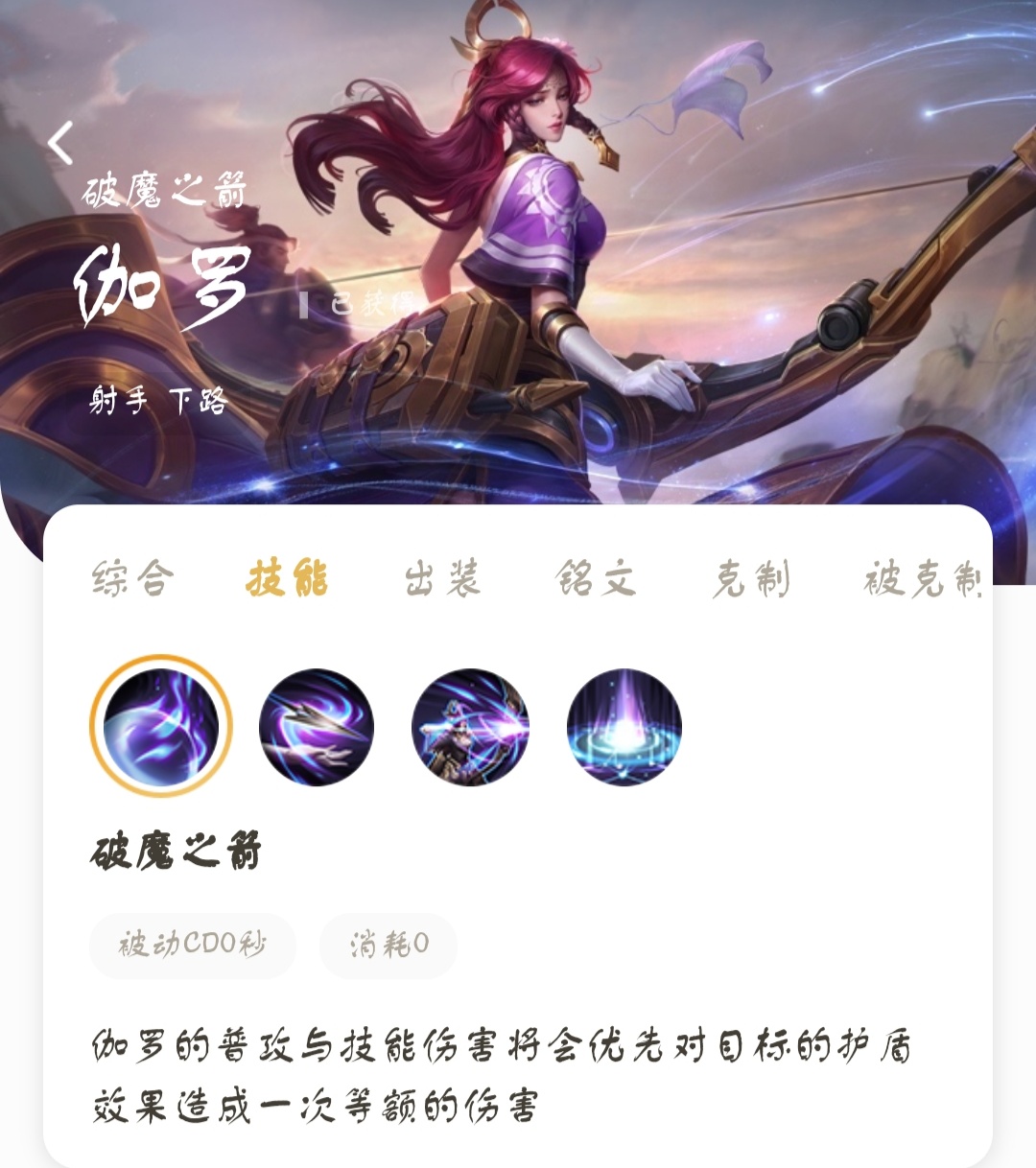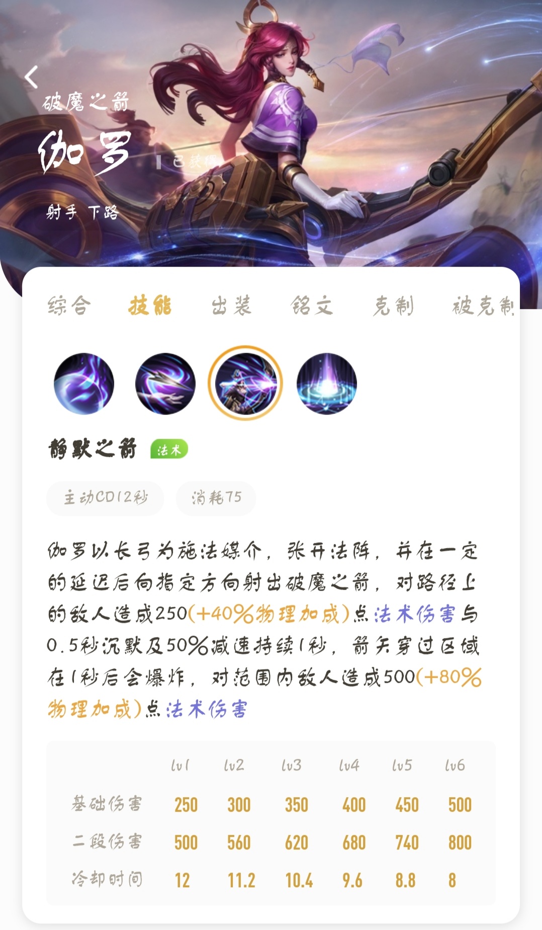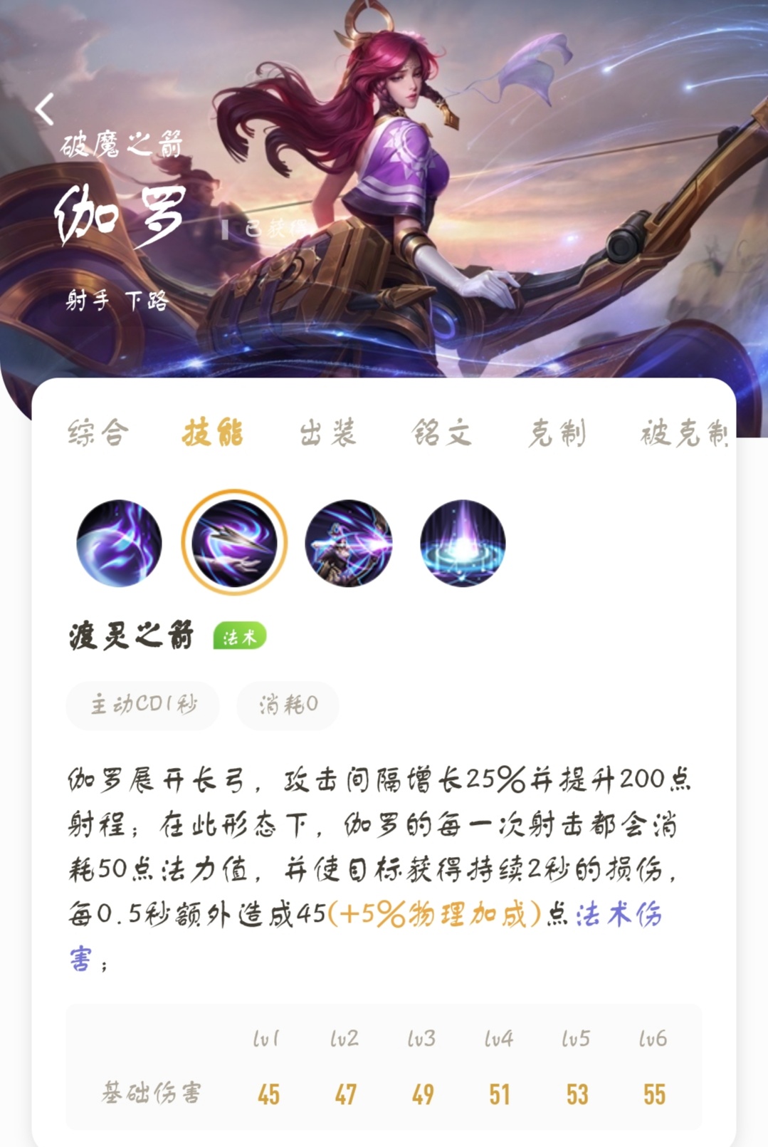 | S16赛季已经过去一段时间啦,小伙伴们有没有达到自己理想的段位呢?今天我给大家分享的这个英雄,相信大部分人都很怕她,因为在中后期她的风筝能力真的是太强了,遇到她时你感觉你能走,可事实上你完全走不掉,因为她的手真的是太长了,相信大家也都知道这个英雄是谁,这个英雄就是伽罗。伽罗和百里守约是王者峡谷中射手里边射程最远的两个人,虽然守约的二技能更远一些,但是需要一定的手感,不一定能百发百中,但是你一旦被伽罗缠上,一般你就等着复活吧。 伽罗在开启长弓形态下射程范围更大,因此有很大好的风筝能力。伽罗是一个靠普攻杀人的英雄,当敌人有多段位移,那么伽罗可能就会追不上敌人。因此有一个好的辅助跟着伽罗,会让伽罗在前期打出更好的优势。今天我给大家推荐的这个辅助就是太乙真人,伽罗和太乙真人搭配上分真的很简单,我们首先来看一下伽罗的技能。 被动技能-破魔之箭:伽罗的被动就是当她和敌人遭遇时,她的第一次普攻伤害和技能伤害会优先打掉敌人的护盾,因此当伽罗面对王昭君这种自带护盾的英雄时,伽罗的普攻伤害和技能伤害会先将昭君的护盾打掉,再进行其血量的消耗。 一技能-渡灵之箭:当伽罗释放这个技能的时候,她手里拿的短弓会展开变成长弓,在这个形态下伽罗的攻击射程会变大,并且伽罗在使用长弓对英雄进行普攻时,会对敌人额外造成法术伤害。如果伽罗不想用长弓时,关掉后会立刻提升伽罗的移动速度,并将射程恢复到原来的距离。这里要注意的是伽罗用长弓进行普攻时,会对蓝量消耗很大,因此在和敌人对战时,要时刻注意自己的蓝量,来决定长弓是否开启。 二技能-静默之箭:伽罗的这个技能和虞姬的一技能有些类似,都是远程消耗技能。当伽罗释放这个技能时会向指定方向射出一支长箭,这只箭会对这个方向上的敌人造成法术伤害和减速效果。因此在前期对线的时候可以利用这个技能对敌人进行消耗和清理兵线,后期团战时也可利用这个技能消耗敌人。这里要注意的是这个技能释放的时候会有一定的延迟,因此要预判好敌人的走位再释放这个技能。 三技能-纯净之域:当伽罗释放这个技能的时候会在自身周围出现一个法阵,这个法阵可以手动关闭。伽罗站在这个法阵里边进行普攻可以给自己和队友提升暴击率,同时这个法阵开启和关闭时也会对敌方造成法术伤害。这里要注意的是这个法阵的关闭时可以帮助自己和友军撤退或追击敌人。 推荐铭文:10无双 10鹰眼 10狩猎 推荐出装:急速战靴、闪电匕首、无尽战刃、泣血之刃、破晓、贤者的庇护(名刀·司命) 出装分析:一般射手都会先出攻速鞋,这样可以为自己增加攻速,打出更多的伤害;前期伽罗出到闪电匕首和无尽战刃可以给自己增加暴击和物攻,并且闪电匕首还有减速敌人的效果,帮助伽罗留住敌人;中期出一件泣血之刃是很有必要的,这样可以减少回家的次数和时间,可以更好的发育;接着出一件破晓,这件专门为远程射手准备的装备,在后期可以帮助伽罗打敌方的前排英雄更省劲;最后这件复活甲就是防止敌方打野绕后切人,如果伽罗被切,那么整个队伍就会失去一个输出点,团战可能就会不利。 克制英雄:关羽、张飞 由于伽罗极强的风筝能力,使得关羽这种靠跑动才能打出伤害的英雄来说就是一个噩梦,还有向张飞这种虽然很肉,但是也扛不住伽罗的爆炸输出啊。 被克制英雄:兰陵王、阿珂 伽罗不像大小姐孙尚香那样有位移,因此她的短板就是很怕那种有多段位移的英雄,比如韩信;还有那种能够隐身的英雄,像兰陵王,阿珂这类英雄,如果对战中有这两类英雄,那在后期团战时要注意自己走位,尽量和自己家坦克战士待在一起。 推荐连招:二技能+三技能+一技能+普攻 伽罗先用二技能沉默敌人,然后释放三技能来提高暴击率,并且还能减速敌人,最后释放一技能,既能够提高射程,又能增加普攻的伤害。 打法技巧:伽罗一没有位移,二又很脆,在四级甚至前期都会很吃亏,建议在选英雄时和队友商量好,选择一个辅助帮助自己打前期,这里建议选盾山这种能在前排抗伤害,或者像牛魔这种大肉也可以。 在前期伽罗出门先学习二技能,因为二技能可以很快的清理兵线,清完兵线后,在敌人清理兵线的时候,自己可以拿下小河蟹。在辅助配合下消耗和自己对线的敌人,如果对方是那种回血英雄,像铠、吕布,那就可以叫着打野来一起抓一波,然后迅速推掉下塔。在这里要注意不要离对方英雄太近,时刻注意草丛的变化,防止敌方打野来抓人。 中期的时候可以选择继续和辅助在下路带线推塔,也可以选择利用自己手长的优势帮助中上路队友压线推塔。这里要注意的是,在河道外的地方尽量不要单走,很容易被对方打野碰到,一个人还好,如果碰到多个人,没有位移的伽罗那就直接等待复活吧。 后期团战的时候伽罗站位不要太靠前,尽量和自己的辅助或者战士站在一起,防止被敌方打野切到。多用自己的二技能沉默消耗敌人,这对于团战胜利很重要。当敌人和自己家的队友打起来,立马开启大招给队友增加暴击率。自己这时候可以开启一技能,利用自己手长的优势在远处打出伤害,在后期一般被伽罗盯上的人,逃脱的几率很小。 注意: 1、伽罗这个英雄打输出全靠普攻,我们要学会走A打输出,利用好位移减速消耗敌人,打出伤害最大化。 2、无论是在前期对线还是后期团战,伽罗