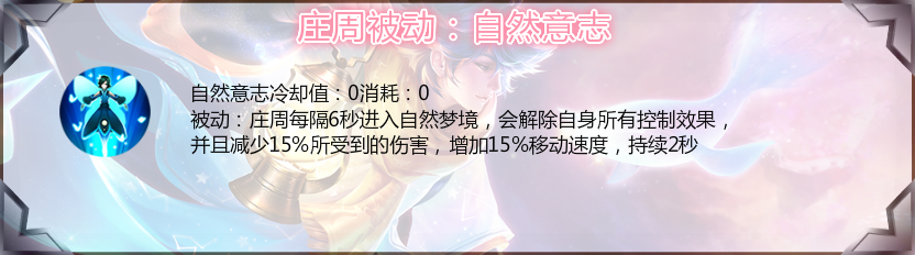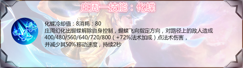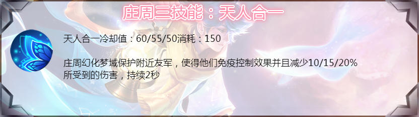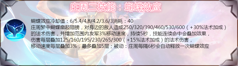 哈喽,小伙伴们大家好,王者荣耀游戏使我们的生活多姿多彩,在冲击王者中每个小伙伴们都有自己喜爱的英雄。你们的本命英雄是哪一个呢?欢迎评论区留言哦 ! 有的小伙伴喜欢玩射手,有的则喜欢玩刺客,S17这个赛季刚开始我一直在用中单法师冲王者,但是到星耀一二的时候发现会非常的吃力,一直在王者门口徘徊。最终我选择换一个位置换一个英雄去试试,结果我用庄周一直从星耀二连胜进阶王者,庄周在上个赛季我一直玩。不论是哪个段位都能帮助队友轻松的赢得排位,在低分段完全可以带动队友逆风翻盘。有的小伙伴们会问了 ,就一个辅助英雄有你说的那么厉害吗?我很肯定的说是的,庄周玩的好照样可以秀起来,轻松上王者,今天就给大家详细介绍一下庄周的玩法吧。 庄周操作难度系数:★★ 庄周生存能力:★★★★★ 庄周技能详解与进阶技巧 庄周被动技能:自然意志。我们在排位中玩庄周或者和庄周对线会发现,庄周会在残血的状态下被攻击时却打不出伤害,丝血逃脱,那是因为庄周的被动效果自然意志。庄周每隔6秒进入自然梦境,会解除自身所有控制效果,并且减少15%所受到的伤害,增加庄周15%的移速。拥有自然意志被动的庄周提升了庄周在线上和团战的生存能力,拥有被动的庄周能够为队友吸收更多的伤害和技能。 庄周一技能:化蝶。庄周的一技能作用非常多,首先能够解除自身的控制,这样能够在面对对方的控制时可以忽略,同时还是一个远程消耗技能,会对路径上的敌人造成法术伤害,还有一个效果就是减少命中目标的移动速度,减速这一个效果在留人上面很有用,可以帮助队友追击也可以帮追队友减速对方,保护队友逃脱。在线上我们可以用一技能去消耗对方的血量,限制对方的发育和续航。 庄周二技能:蝴蝶效应。庄周的二技能蝴蝶效应使得庄周在后期站撸能力上得到了极大的提高,我们经常看到庄周一个人追着对方C位或者坦克跑。那是因为庄周的二技伤害是可以叠加的,在庄周使用蝴蝶效应以后首先会对身边敌人造成法术伤害,也能够增加友军3%的移速,技能连续命中还会叠加法术伤害和移动速度,最多可以叠加到5层,小伙伴会问了,要在前期轻松叠加5层效果很难啊,因为前期的CD冷却时间已经6秒了,这里要注意蝴蝶效应的被动,庄周每6秒,自动释放一次蝴蝶效应。我么可以利用这个被动来实现前期5层效果的叠加。 庄周三技能:天人合一。庄周的三技能是一个神技,因为可以保护附近队友免疫对方的控制效果 ,并能够减少附近队友所收到的伤害,持续的时间为2秒。在团战中面对范围控制技能让人很头痛,因为被控到完全没有输出机会,很容易被团灭一波翻盘但是有了庄周在场效果就不一样了,我们在排位中看到对方选择甄姬、王昭君后都会去选择庄周克制,这样面对对方的大招都能够有效的化解控制,保护队友。 庄周技能进阶技巧 1.拥有自然意志的被动会增加庄周的生存能力,在受到攻击后,可以利用被动的移速加成轻松逃脱,在团战中,可以先入场吸收一波伤害和控制帮助队友吸收伤害。 2.一技能不仅仅是用来消耗对方,和减速留人。还有一点作用就是解除庄周自身的控制,提高庄周的生存能力。 3.蝴蝶效应的叠加在前期可以利用被动去叠加,在后期装备的减CD很容易叠加层数,这样可以轻松打出最高的法术伤害。 4.庄周大招的使用时机不是在队友被控制以后使用,而是预判在对方使用控制技能之前使用效果最好,天人合一持续时间为2秒,先手效果最佳 。 5.上单加点推荐:主加二技能,辅加一技能,有大招点大招。辅助加点推荐:主加一技能,辅加二技能,有大招点大招。 庄周前期对线和团战技巧 辅助篇:庄周辅助,前期出门可以去对方蓝buff游走一波,先别点技能,如果对方红开或打野一人,我们可以先加二技能,利用二技能可以叠加伤害的效果,能够自己单独一人快速的清掉蓝BUFF怪,限制对方打野发育。如果面对对方打野一人,我们可以先和对方站撸,但不要追的过深,注意对方其他英雄的位置,如果对方来支援尽快撤退。如果没有人支援那么面对一级的打野完全不虚,轻松击杀。在线上辅助射手的时候多用一技能去消耗对方射手和辅助,既能减少对方血量,又能限制对方发育。利用自身被动效果多帮队友探视野,一技能也可以探草丛。在面对对方追击时注意使用二技能,因为二技能能够提高庄周和友军的移动速度,快速撤退。 对抗路篇:庄周用来打对抗路也很不错,万金油的存在,我们在对方补兵时可以利用一技能去消耗对方,当对方没有技能的时候,贴身使用二技能,利用二技能的伤害叠加和移速加成,走位躲技能,持续输出,对方英雄面对庄周的输出也会无可奈何。玩对抗路还是以出肉装为主,如果要想打的激进一点可以适当出一两件法术装备,提高庄周的伤害值,在后期面对对方C位时完全可以吊打对方。庄周后期可以带线,在清线速度很快,面对对方两个人来抓也一点不虚,这样能够一直牵制着对方,利用机会让队友打掉主宰和暴君,取胜很轻松。 团战篇:再团战时,如果是作为辅助一定要先以保护后排为主,不要只想着去前排抗伤害,追着对方C位,保护我方输出才是关键。庄周的保后排能力一点也不弱,减控和抵免伤害能够为队友提供安全的输出环境。如果是作为前排,我们可以先开团去吸收伤害,扰乱对方的阵型,如果对方有甄姬类的团控法师,可以逼出对方