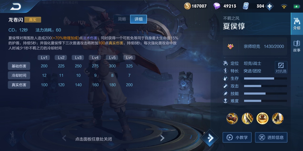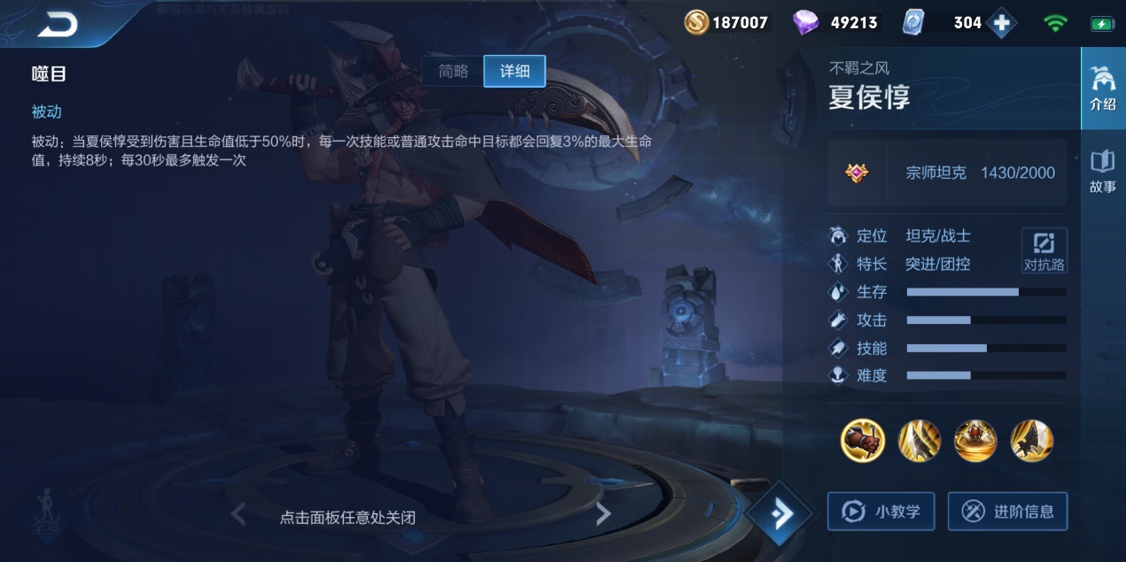 夏侯惇这个英雄可以算是非常的全面,有坦度,有输出,有软控,有硬控,有位移,有回复,有盾,有真伤。夏侯惇这个英雄还有一个特点就是面对任何边路英雄都不会劣势,也不会优势,基本都是55开,就算是打不过也不至于被单杀,毕竟本身的坦度还是非常高的,很适合不会玩边路,但是补位边路的玩家。 ①装备 装备这里是建议大家出全肉的,虽然夏侯惇的出装方式有很多种,也有很多玩家都选择半肉半输出,也很强,但是这里是给补位玩边路的玩家推荐出装,还是纯肉好一点。半肉半输出的玩法还是适合一些边路玩的比较多,比较精通夏侯惇的玩家。 纯肉的夏侯惇不只是坦度非常高,本身的输出能力也并不弱,有红莲斗篷和反伤刺甲这两件装备就可以保证一定的输出能力,加上夏侯惇本身也有真伤,不用担心出全肉会没有伤害。 ②铭文 蓝色10个调和 绿色10个虚空 红色10个宿命 铭文就用系统铭文页里面的坦克铭文即可。 ③技能技巧 很多玩家玩不好夏侯惇就是没有掌握被动,夏侯惇的被动可以恢复大量的生命值,一次技能和普攻命中可以回复最大生命值的3%,一技能两段可以触发两次,大招的两次伤害也可以触发两次,加一个二技能,加三下普攻,这就是24%的最大生命值,这还是算的比较少的,毕竟可以持续8秒,基本回复30%到40%的血量是很正常的,所以在触发被动的时候不要怂,我们的血量回复是非常快的。 在触发被动以后状态栏会有显示,看到被动出来以后我们就可以打的刚一点了,如果我们的血量一直低于50%,那么被动冷却好了也不会触发,再次冷却才会触发。 还有就是很多玩家玩夏侯惇喜欢主一技能,其实夏侯惇是应该主二技能的,一技能升级只是增加一点伤害,二技能升级可以减少冷却时间,而且增加的伤害是真实伤害,性价比要远远高于一技能。 ④前期打法思路 夏侯惇前期的战斗力不算弱,我们只需要注意一下对线英雄的强势期,避开他的强势期跟他打,一般都不会占下风,我们有盾有回复是不怕对拼的,一会血量就回复了。如果我们前期可以通过队友帮助等建立起优势,那我们就可以打的凶一点,对面边路出来我们就上去刚,有经济优势的时候大部分的边路都打不赢夏侯惇了。 如果我们前期算是处于劣势的,那就要尽量保证自己不被单杀,然后控制好河道蟹,对面打我们就可以大招过去抢,然后开个盾往回走,依靠我们自身的坦度硬生生的抢河道蟹,避免经济差距被拉开。 前期如果有优势可以快速清线的话也可以去帮一下中路,直接大招先手能杀就杀,或者是去帮中路收一下河道蟹,增加一下经济。夏侯惇只要前期有等级和经济优势,打边路的还是非常好打的,基本都可以压。 ⑤召唤师技能选择 召唤师技能推荐大家带终结,因为我们是全肉的出装,输出能力肯定是有限的,我们又是补位出来的边路,前期带一个终结对线会好打很多。 ⑥团战打法 夏侯惇的团战打法还是比较简单的,可以选择切后排,也可以选择保护后排,这个就看局势来决定了,但是我们要做的一定是在人群中抗住伤害,尽量控制住更多的人。 夏侯惇的攻略到这里就结束了,喜欢的可以点一波关注哦~ 编辑:叶子猪小秘书