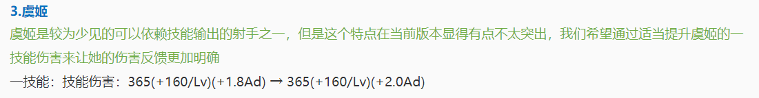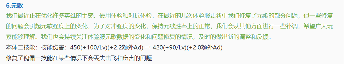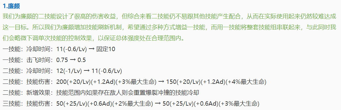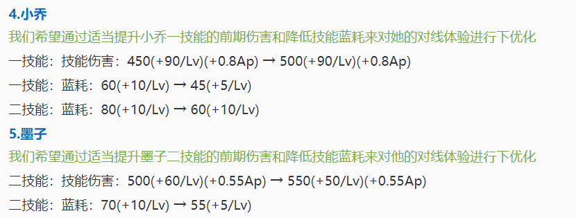 4月17日,体验服更新,本次更新有两大看点,一是新英雄蒙恬上线,二是6个英雄得到调整。由于蒙恬属于第一次上线,还处于早期测试阶段,所以今天不在本文讨论内。 在调整的6个英雄中虞姬、小乔、墨子加强,廉颇、鲁班强度平衡,元哥强度降低,我们重点来说说虞姬、小乔、墨子、廉颇和元哥这5个英雄。 以下都是体验服数据,最终版本请以正式服为主。 一、小乔、墨子前期伤害各增加50点 在新版本的体验服中,小乔的1技能基础伤害从450增加到500,伤害增加50点,同时1技能和2技能的蓝耗,墨子2技能基础伤害从500增加到550,也增加了50点伤害,同时2技能的蓝耗降低了15-40点。 评价: 小乔和墨子都是典型的炮塔型法师,属于手长爆发高,善于打POKE伤害,小乔在爆发上要高于墨子,但墨子的自保能力要强于小乔。这两人都属于需要较长发育时间的英雄,前期因为经济不高,所以伤害也会略显不足,这次双双加强了2人的技能基础伤害和所消耗的蓝量,增强了这两人前期的作战能力。 所不同的是,小乔属于增加型加强,后期的伤害成长没变,墨子属于前后伤害平衡,把后期的一部分伤害调到了前期,所以小乔加强的效果更明显。 英雄正式服版本的强度 目前这两人在现版本法师中的强度属于中规中矩,不算强,也不算弱,有绝活的玩家依然可以用这两个英雄CARRY,墨子的操作更复杂有点,绝活玩家可以打出不错的效果。 二、虞姬1技能伤害增加160点,元哥2技能降低170点 在新版本的体验服中,虞姬1技能物理额外伤害增加了20%,从1.8AD增加到2.0AD,一般情况下,神装虞姬的物理面板在800左右,所以体验服虞姬1技能伤害增加了160点。 元歌本体2技能在基础伤害、等级增加伤害和额外AD伤害都有降低,基础伤害降低30点,等级伤害总共降低40点,额外AD伤害降低差不多100点左右。 这里也跟大家简单解释一下额外AD,如下图,在元歌的物理攻击数据里有2个数据,分别是352和502,352就是元歌英雄满级后本身所拥有的攻击,502是装备、铭文和皮肤所带来的物理加成,也就是额外的AD,可以看到额外AD为500左右,经过计算,新版体验服元哥2技能额外伤害加成降低了100点伤害左右。 评价: 虞姬1技能只是加强了后期的伤害,前期没动,其实虞姬前期对线的时候比较频繁的运用1技能,所以这次调整不会对前期虞姬线上能力有什么太大影响。 元歌这次是2技能是全方面削弱,不管是前期的对线还是中后期的输出秒人,都有一定的影响。 英雄正式服版本的强度 这两个英雄现版本也是中规中矩,虞姬属于百搭型射手,在面对刺客英雄时有不错的反制效果,一般来说,顺风的虞姬会有点无解,这次1技能的加强,增加了逆风时面对虞姬翻盘的难度。 元歌这个版本位置比较尴尬,首先的定位,早期的元歌可以打野、中路和边路,后来逐渐主中和主边,但元哥本身很脆,目前版本边路坦克崛起,对于元歌来说是个坏消息,而走中的话,阵容中就缺少了法术伤害,对于中后期打团影响也比较大。 三、廉颇强度平衡 首先要让大家明确的是,这是体验服新版本的廉颇(还没正式上线正式服),不要与正式服的廉颇相联系。 这次廉颇1、2、3技能都有调整。 首先1技能的CD增加,之前满级是8秒,现在固定10秒,击飞时间少了三分之一,2技能的冷却时间总体增加了1秒,但总额伤害增加了,考虑到廉颇血量很容易达到1万点以上,所以2技能的伤害还增加了100点左右。 但这次2技能调整有个亮点即:技能范围内如果存在敌人则会重置爆裂冲撞的技能冷却。 简单点说就是可以先用1技能,然后在释放2技能(此时刷新1技能CD)再放1技能,等于可以连续释放两次1技能,但要注意的是,只能先放1技能再放2技能才能刷新CD,如果是先2技能再1技能,是无法刷新CD的。 3技能的伤害总体也提高了100-150点左右的伤害。 评价: 这次廉颇的调整最大的亮点是2技能新增加了技能效果:技能范围内如果存在敌人则会重置爆裂冲撞的技能冷却。 直观一点说的话,新版廉颇1技能配合闪现+大招可以打出6段位移,这就极大的提高了廉颇的可玩性,强度直接上升一个档次不仅增加了廉颇的控制能力,也增加了廉颇的开团能力和自保能力,两段1技能,进可攻退可守,如果这次体验服的调整能够最终上线正式服,那么廉颇肯定会成为最热门的辅助人选,也是大家最期待的英雄! 以上全部为体验服数据,不代表最终上线数据,以正式服数据为主。 编辑:叶子猪小秘书
