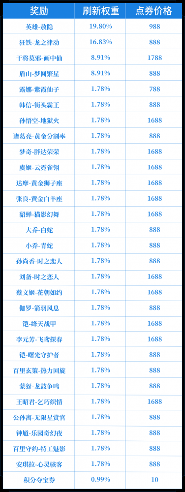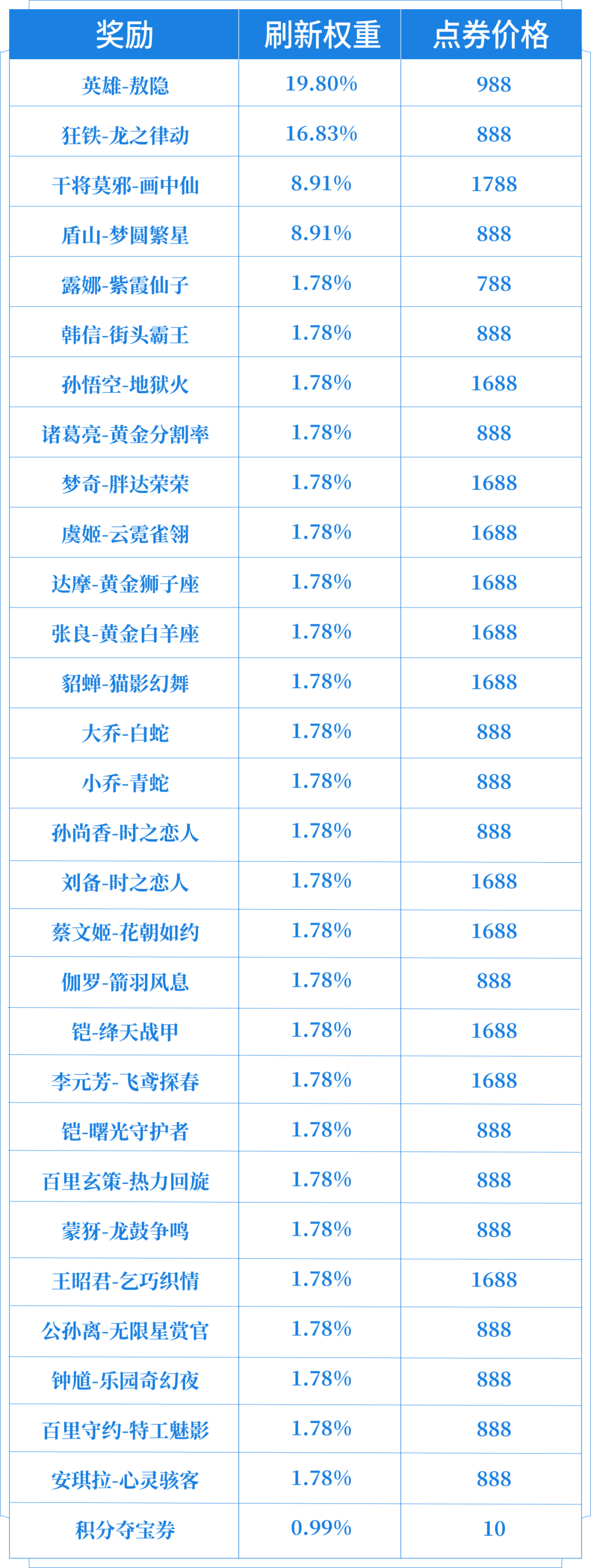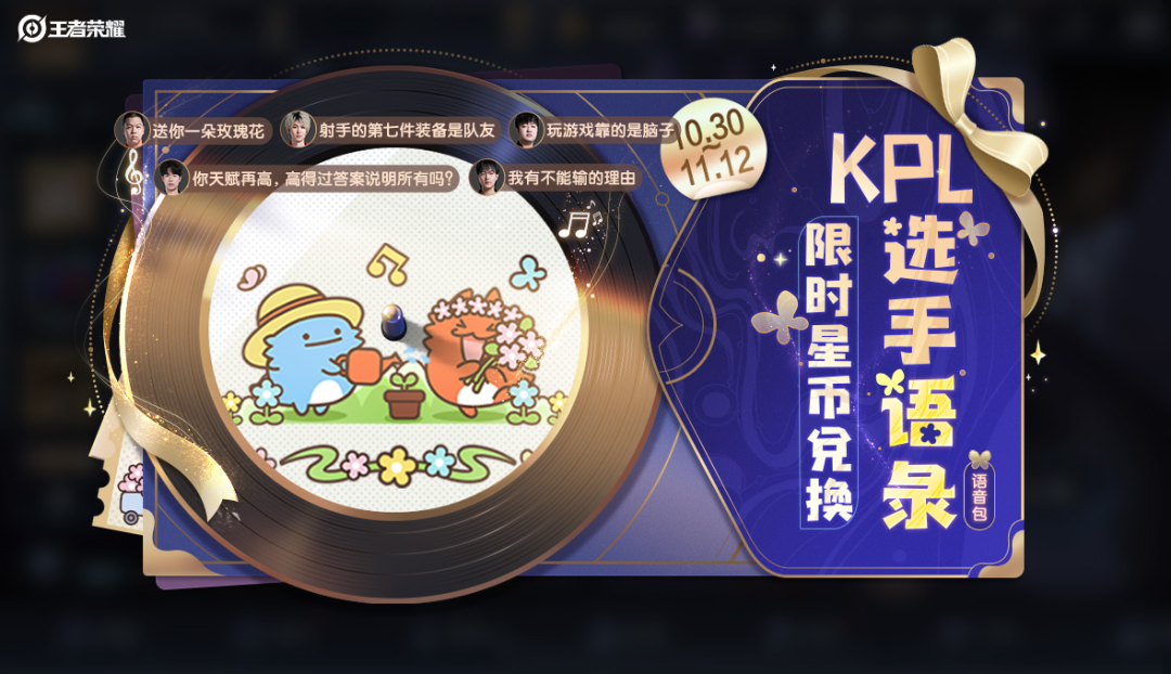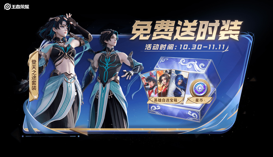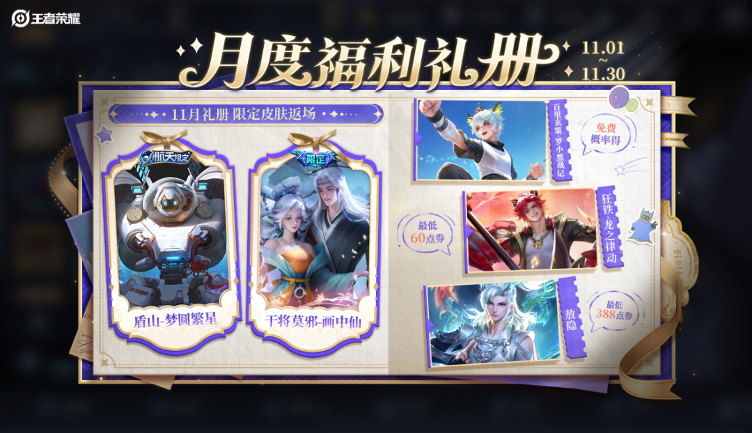 2025KPL年度总决赛版本全新上线,多活动同步开启,邀你与本命英雄一起线上鸟巢观赛、为选手助威!参与活动可获取多项免费福利。 这一次,鸟巢见!和本命共赴新赛场吧~ 重点福利/内容速览: 免费领时装活动,送全新元流时装、SNK英雄自选宝箱、星币奖励; 这一次,鸟巢见!活动体验线上鸟巢观赛打卡,本命英雄送你冠军纪念头像框; SNK英雄皮肤中文语音限时领取活动上线,体验SNK中文语音; 星币专区上新:蔬菜精灵联动阿古朵-顽趣星元萌趣来袭、全新2025KPL年度总决赛回城开启兑换; KPL明星选手“语录”,星币限时兑换,趣味语音等你来玩; 11月礼册即将开启,免费奖池领奖次数刷新,折扣奖池返场干将莫邪-画中仙、盾山-梦圆繁星。 免费领时装活动, 拿元流时装、SNK英雄、星币等好礼 活动时间:10月30日逐步开启-11月11日23:59,兑换持续至11月12日23:59 活动入口:【游戏内大厅】-【活动中心】-【KPL年度总决赛】-【免费领时装】 活动期间完成任务可获得时装活动积分,消耗积分兑换元流之子-登天之途、SNK英雄自选宝箱(娜可露露、不知火舞、橘右京、英雄碎片)、星币等心仪奖励,详见后续活动公告。 这一次,鸟巢见! 线上与本命英雄合影送冠军头像框 活动时间:11月5日逐步开启-11月11日23:59 活动入口:【游戏内大厅】-【活动中心】-【KPL年度总决赛】-【送冠军头像框】 参与活动,完成KPL年度总决赛线上鸟巢现场打卡,即可获取全新2025年度总决赛冠军纪念头像框,详见后续活动公告。 SNK英雄、皮肤中文语音领取活动 限时开启 活动时间:10月30日版本更新后-11月12日23:59 活动入口:【游戏内大厅】-【活动中心】-【KPL年度总决赛】-【领中文语音】 拥有娜可露露、不知火舞、橘右京、娜可露露-晚萤、不知火舞-魅语、橘右京-修罗,即可领取对应中文语音。 KPL选手趣味“语录”,限时星币兑换 “KPL语录”语音包上架,内含5条KPL选手语音: 成都AG超玩会.大帅(孟家俊):送你一朵玫瑰花 成都AG超玩会.一诺(徐必成):射手的第七件装备是队友 上海EDGM.爱思(唐田):玩游戏靠的是脑子 武汉eStarPro.花海(罗思源):你天赋再高,高得过答案说明所有吗? 济南RW侠.Fly(彭云飞):我有不能输的理由 上架时间:10月30日版本更新后-11月12日23:59 兑换方式:【游戏内大厅】-【商城】-【商品】-【语音页签】或【游戏内大厅】-【商城】-【商品】-【道具页签】,上架期间限兑1次,兑换使用后有效期30天 兑换价格:100星币 星币专区上新,蔬菜精灵联动星元、 全新回城“登阶者”等你兑换 阿古朵-顽趣星元部件上架 蔬菜精灵联动第二弹【阿古朵-夜趣】来了!以惊奇夜游园会的主题为包装,阿古朵将穿上萌趣小道士的衣服,白菜狗化身“菜僵僵”二者共同开启一场别开生面的冒险! 上架时间:10月30日版本更新后-2026年1月30日 价格: 夜趣·发型:300星币 夜趣·服饰:600星币 夜趣·武器:900星币 2025KPL年度总决赛回城特效-登阶者 佩戴后,你所拥有的英雄和皮肤在回城时,可获得登阶者回城特效。 上架时间:10月30日版本更新后 价格:250星币 11月月度福利礼册即将开启 10月礼册关闭时间:10月31日23:59:59 11月礼册开启时间:11月1日00:00:00 10月礼册即将关闭,还未领取奖励的玩家,记得在刷到想要的奖励后及时领取! (领取并不会导致刷新保底进度重置,每月均有1次领取机会,可以放心领取~) 同时,每月刷新币会清零,不会自动转换为进度,建议用完所有刷新币哦~ 免费皮肤奖池重置 新一期月度福利礼册的免费皮肤奖池任务、任务奖励、奖池内容均不变,10月如果没有刷到心仪奖励,接下来的礼册都还有机会哦~ *各类型奖励列表详情请见官网公告。 惊喜折扣奖池更新 本次更新了2款限定返场皮肤:干将莫邪-画中仙(传说)、盾山-梦圆繁星(史诗); 刷新概率、折扣概率均保持不变,惊喜折扣奖池详情: 女娲-万灵启世皮肤上架商城 她诞生于人与自然的羁绊中。从共筑天地间第一个“家”,到处处留下万灵的图纹,她一直陪伴着这片大地的生命共生共息。 祭典之上,人神相会,百兽遍野同行,在共同的家园中再次齐集。 那是过去,是现在,也是未来。 上架时间:10月30日00:00-12月24日23:59 品质:史诗限定 标签: 价格:888点券(首周价格:710点券) 百里玄策-罗小黑战记皮肤上架商城 o(`ω′ )o进入游戏世界的小黑,思索后决定选择百里玄策出战,并根据自己的特征捏起了皮肤—— 上架时间:2025年11月1日00:00-2026年9月30日23:59 品质:史诗限定 标签: 价格:888点券(首周价格:710点券) 上架后至2026年9月30日23:59前,该皮肤仍可在月度福利礼册中免费概率获取。 新增局内限时“新剧情语音” 魔神复活在即,神职者及其后裔们已然集结。当力量汇聚在一起之时,定能冲破一切黑暗! 王者荣耀限时“新剧情语音”正式上线,当使用特定英雄原皮肤于泉水出生时,会触发特殊语音。本次更新的内容有: “空空儿、哪吒、蚩奼、老夫子、海月、朵莉亚、李白、曜、镜、伽罗”的单人泉水出生语音。 “哪吒和蚩奼、曜和李白”的双人泉水出生语音。 元流之子海报拍摄资源上新 版本更新后,在【游戏内大厅】-【英雄】-【元流之子】-【方案】-【拍摄海报】-【表情】中,新增了4个免费解锁的新表情,可在系统中直接使用。 同时商城也上架了4个海报动作,可使用星币兑换: 元流海报动作:抬手、歪头、侧身、比耶 上架时间:10月30日更新后 购买位置:【游戏内大厅】-【商城】-【道具