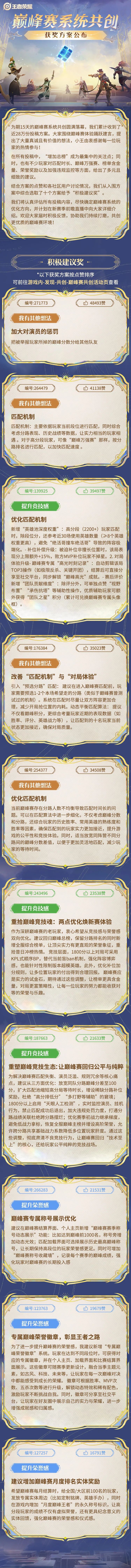 什么?巅峰赛系统共创获奖方案来了? 狐来履行告知的义务~! 为期15天的巅峰赛系统共创圆满落幕,我们累计收到了近28万份投稿方案。大家围绕巅峰赛体验踊跃建言,提出了大量真诚且有价值的想法,小王由衷感谢每一位玩家的热情参与! 在所有投稿中,“增加总榜”成为最集中的关注点;同时,也有不少玩家对匹配时长、巅峰万强赛、榜单含金量、荣誉奖励以及加强违规监控等方面,给出了多元且细致的建议。 结合方案的点赞和各社区用户讨论情况,我们从入围方案中综合选取了十个方案给予“积极建议奖”。 我们将认真评估所有投稿内容,尽快确定巅峰赛系统的优化方向,并计划在新赛季前瞻直播中向大家详细介绍。欢迎大家届时积极反馈,协助我们持续打磨,共创更优质的巅峰赛环境! 编辑:月光下完美