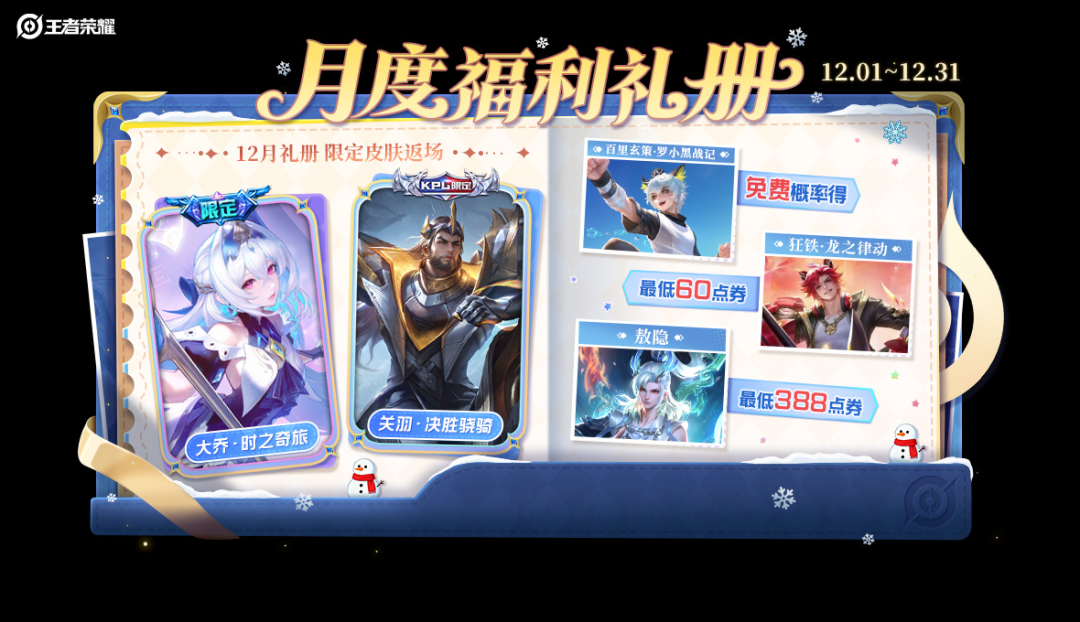王者荣耀 限定皮肤【大乔-时之奇旅】&【关羽-决胜骁骑】12月礼册返场!终极觉醒·无尽