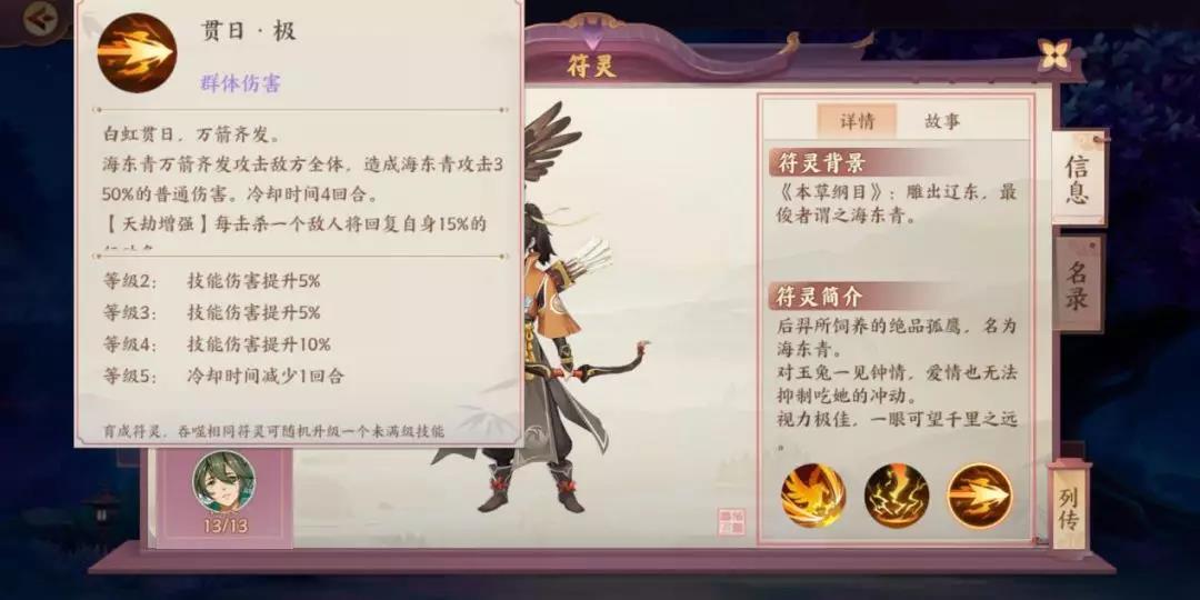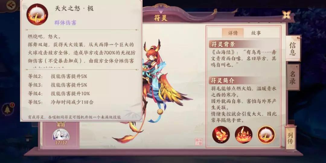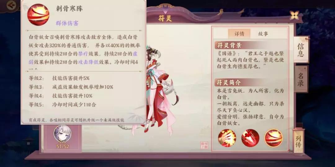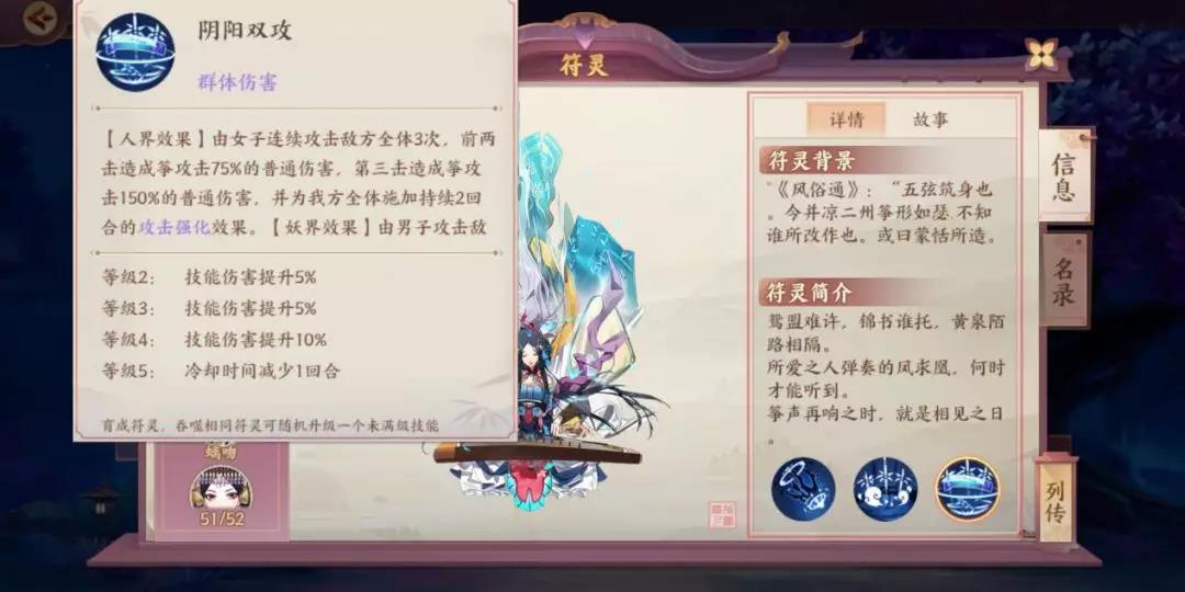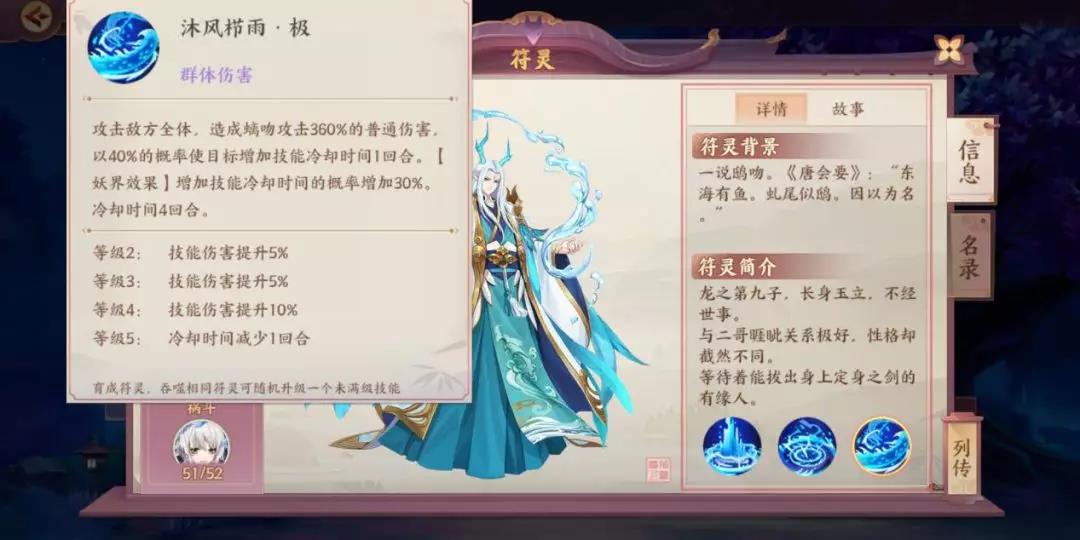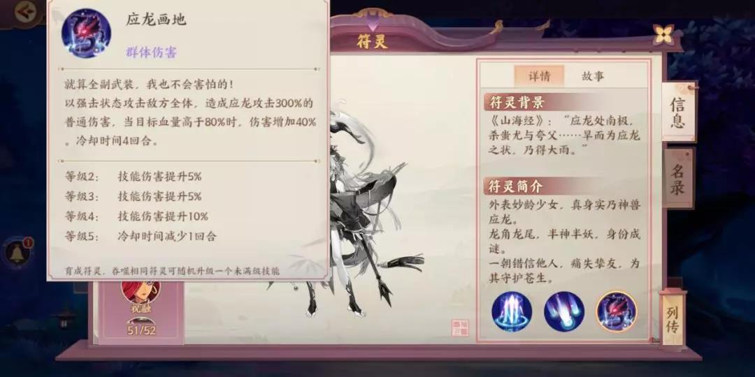 在云梦之境中,想必各位灵主大人都期望早日把自己心仪的符灵升级满星,但这一操作势必需要大量的狗粮。那么问题来了,什么样的符灵能够快速刷图带狗粮呢? 划重点,赶紧拿起小本本记下来!!! 答案是——拥有强力AOE技能的符灵。AOE技能越多、CD越短、伤害越高、攻击目标数越多的符灵,也就越适合带狗粮~ 所以,下面就让小籍为各位灵主大人介绍下云梦之境中这些优秀的狗粮队长吧~ 符灵知识 狗粮大队长之——【绝品篇】 壹 应龙 颜值 ★★★★★ 玲珑娇小的身材,配合夸张的武器,有种意外的反差萌。 输出 ★★★★★ 技能分析:应龙的3个技能,全是以强击状态进行攻击的,也就是说,不管是在人界亦或是妖界,应龙的技能伤害都会增加30% 应龙的大招会根据敌人血量的高低而变化,当敌人血量高于80%的时候,应龙的伤害会增加40%。除了她的大招是个AOE技能,应龙的二技能也相当于半个AOE技能。 以强击状态随机攻击敌人4次,当渡劫到天劫后,该技能的冷却时间还能减少1个回合,加快了二技能的攻击频率。 如果在带狗粮刷图的时候,应龙能够先手开大,强击状态加上敌方血量高于80%的条件,同时再配上亢金龙的首个行动者的双倍伤害效果,那么它的伤害加成是非常恐怖的,极有可能一波带走对面,刷图速度不可谓不快。 养成难度 ★★★★ 作为绝品符灵,应龙除了可以通过“七日蕴灵”的活动获取,还可以通过召唤获得想要提升应龙的技能,除了通过喂掉相同符灵提升技能这一通用方法外,还可以通过使用高级禄星来升级,两者到底孰难孰易,就全凭灵主大人的选择啦。 保值 ★★★★★ 应龙除了带狗粮厉害,它在PVP、BOSS战等方面也十分强力,在绝品类的符灵中属于第一梯队,甚至很少有能与之匹敌的。但弊端是,应龙这一符灵没有控场能力,在进行PVP对战或者挑战BOSS的时候,最好能搭配一些带有控场能力的符灵。 贰 螭吻 颜值 ★★★★★ 仙风道骨的气质,配上玩世不恭的表情,感觉特别的强大。 输出 ★★★★★ 技能分析:螭吻也是个拥有2个AOE技能的符灵,它的大招可以造成螭吻攻击360%的普通伤害,这个伤害系数在拥有AOE技能的符灵中算的上是比较高的了。 他的二技能可以向敌人释放水波,造成螭吻攻击180%的普通伤害,并击退敌人10%行动条,当二技能命中后,它会随机弹向其他敌人,有几率连续弹射,最多弹射10次。 当处于妖界的时候,它可以至少弹射3次,虽然从伤害系数上看没有大招那么高,但是如果运势爆棚,弹射次数超高,那么二技能和大招的伤害也是相差无几了。 可以看出,拥有2个AOE技能的螭吻,担任狗粮队长是完全不在话下的,2个AOE技能砸下去,刷图想不快都难。 养成难度 ★★★★ 螭吻目前只能通过召唤获得,而要想升级螭吻的技能,他与应龙一样,除了通过喂养相同符灵提升技能等级之外,还可以通过使用高级禄星来升级。 保值 ★★★★★ 在绝品类的符灵中,螭吻的使用和保值程度同样可以排在第一梯队。它不仅有输出能力,控制能力也非常不错,可以克制一些大招CD时间比较短的符灵,或搭配控制类符灵打控制流,延迟对面释放大招的时间。 ? 叁 白骨妖女 颜值 ★★★★★ 美艳的脸庞配上森冷的白骨,仿佛带刺的玫瑰,让人又爱又畏。 ? 输出 ★★★★★ 技能分析:白骨妖女的大招是个AOE技能,会有概率使得敌人受到禁疗、虚弱、攻击降低的效果。 二技能“傲骨”则是个单体伤害的技能,“傲骨”的伤害会根据敌人的血量高低而变化,血量越低伤害就越高,如果在妖界场景下,使用二技能成功击杀一名敌人的话,还会使用一次无视技能CD的大招。 因此在白骨妖女带队的情况下,最好尽可能地多带一些“人”属性的狗粮,使白骨妖女取得先机释放大招,这样即使因为弱击伤害指数不一定很高,但也极大地削减了敌人的血量,那么等到下个回合再释放二技能,又正好处于妖界,因为强击的关系,很可能直接秒杀一个敌人,接着直接开启无视技能CD的大招,这样一套技能的搭配,带着狗粮刷图,肯定也是很快的。 ? 养成难度 ★★★★★ 白骨妖女目前只能通过召唤获取,而想要升级技能,可以通过使用高级禄星或者喂养相同符灵来提升技能等级。 保值 ★★★★ 白骨妖女二技能的释放时间很关键,若能够搭配一些强力输出类的符灵,来配合白骨收割,想必也是个不错的阵容。 肆 洛神 ? 颜值 ★★★★★ 一杯清酒,一树梅花,一席黑衫,越发衬托了他的儒雅。 输出 ★★★★★ 技能分析:洛神的大招是个AOE技能,可对敌方全体造成3段攻击,有几率造成2回合的沉默,当处于人界的时候释放大招,还有概率使敌人受到防御降低的效果。 洛神的被动技能,会使他受到的普通攻击伤害降低30%,当渡劫到天劫后敌人使用普通攻击时,还会额外增加10%的行动条。 因此使用渡劫到天劫后的洛神带狗粮刷图,由于被动的关系,他的攻击频率会提高很多,进而也加快了带狗粮刷图的速度。 养成难度 ★★★★★ 洛神目前只能通过召唤获取,想要升级技能,可以通过使用高级禄星或者喂养相同符灵来提升技能等级。 保值 ★★★★ 洛神的普通攻击与大招都有概率让敌人受到沉默,很少有符灵拥有这个buff。到了后期,大家的符灵都成长起来了,伤害也日益提高,所以沉默这一控制便变得非常关键。 伍 筝儿 ? 颜值 ★★★★★ 作为云梦之境中唯一一个双人符灵,两人相拥着弹筝,唯美动人,如诗如画。 输出 ★★★