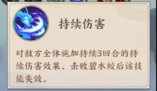 持续伤害?碧水蛟 两条水蛟的技能大大加快了DEBUFF的叠加,使BOSS行动时可以直接触发一次3层以上的持续伤害。 BOSS的技能 死亡印记 群体攻击,且有几率给目标添加2层3回合持续伤害,冷却1回合。 毒性爆发 全体攻击,若目标身上有持续伤害效果3层以上,则直接触发一次持续伤害,冷却2回合。 毒伤 攻击单体目标,概率造成3回合持续伤害。 通关难点 渡劫?妖最终BOSS和左右两条水蛟会快速的给己方叠加大量的掉血BUFF,一旦被加DEBUFF达到3层,BOSS的攻击会直接触发一次持续伤害,层数越高,伤害也就越高。