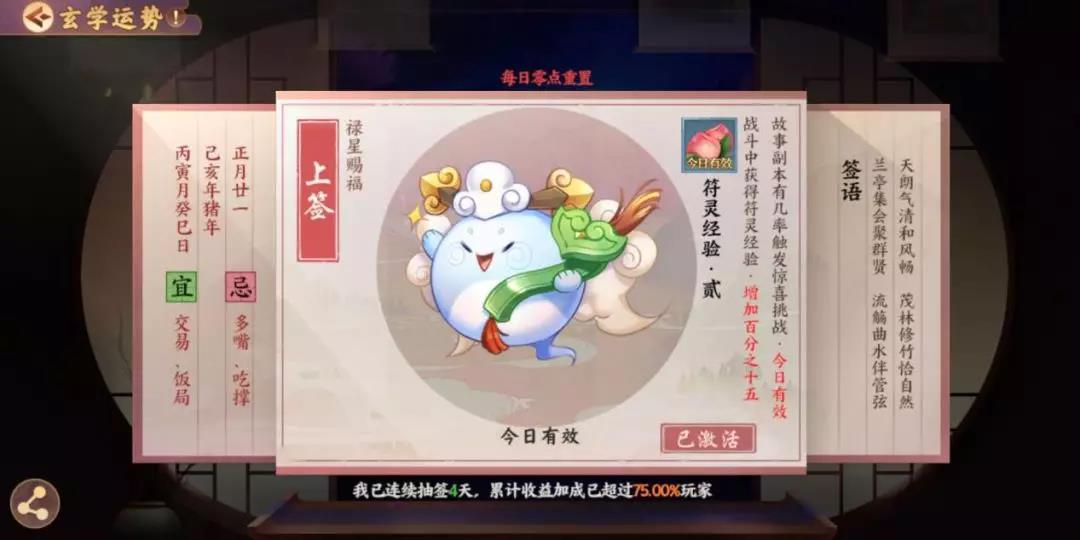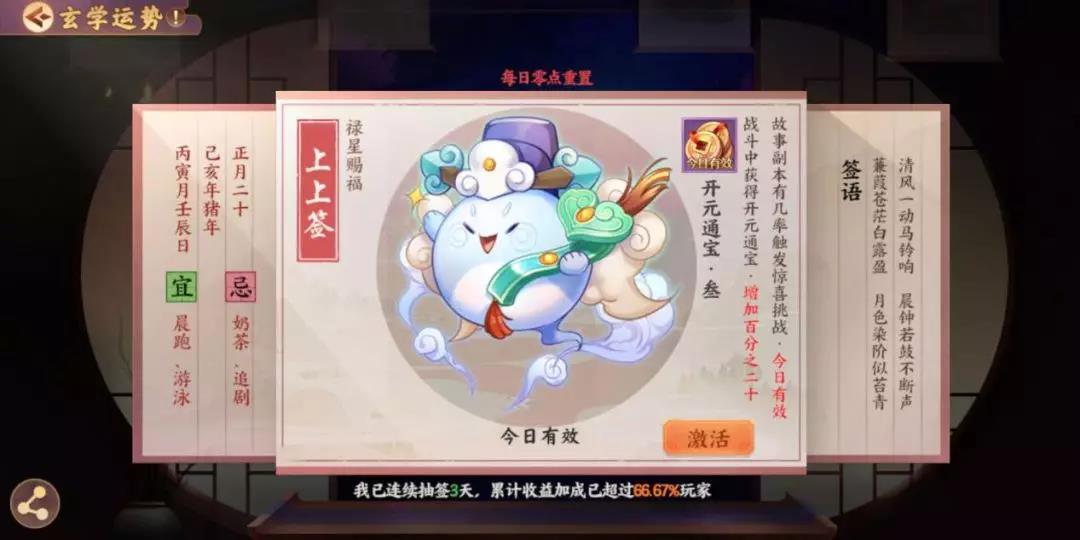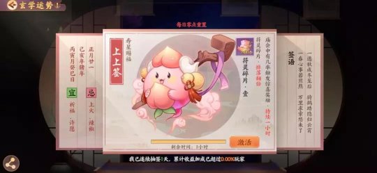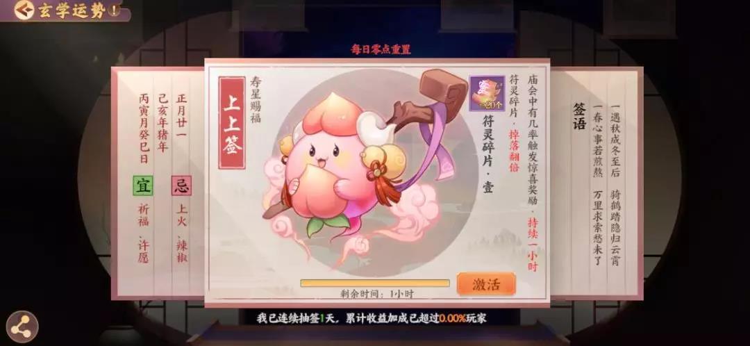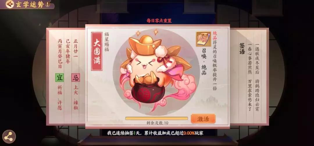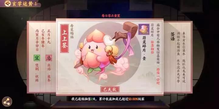 或许很多人都觉得 玄学虚无缥缈,无所循矩 但是在《云梦四时歌》中 它却是非常核心的一项玩法 甚至时刻在影响着游戏的步调 那么这个玄学到底有多玄呢? 灵主大人们擦亮眼睛 接下来就由小籍为大家揭开 “玄学运势”的奥秘~ 摇签祈福? 玄可救非 说起云梦之境中的摇签玄学,想必灵主大人们并不陌生,而摇签所导致的“运势”,就得由小籍讲上一讲了~ 运势只能通过每日一次的摇签获得,不同的运势对不同的游戏行为产生收益加成,简单来说,无论如何运势都是个相当有利的东西呢! 激活运势后,即可获得相应的效果加持,这时候大人们就能带着自己独一无二的运势加成,去为所欲为啦!! 运势赐福小贴士 运势总共分为3大类:福星赐福、禄星赐福、寿星赐福。 这三类运势,均会对:召唤、符灵经验、开元通宝、渡劫材料、星宿材料、符灵碎片等游戏行为产生不同程度的影响。 例如灵主大人想召唤妖属性符灵山鬼,但苦于概率问题无法定夺。恰巧这时候抽取到了“必能召唤属性为妖的符灵”的运势,就大大增强了召唤出山鬼的出货率啦!是不是非常有用!! 运势详解:福星赐福 在游戏中,有一定概率抽到预示着大圆满的签,它的运势是“绝品符灵的召唤概率提升一倍”。一倍的概率,四舍五入就是入欧啦! 当然,福星赐福绝不止这一个品类,更多提升符灵召唤概率的签文,就等你去抽取发现啦~ 运势详解:禄星赐福 众所周知,符灵的成长离不开升级,而升级必须需要经验,而禄星赐福的作用正是得到符灵经验与开元通宝的获取加成。 激活“符灵经验”相关的运势,自然就会对战斗中符灵获得的经验大有增益啦!无论选择哪种方式刷本,只要激活了这支签,积累的经验都会相当可观,对于符灵的成长培育十分有利呢! 在游戏过程中,升级、升星,星宿强化等等一系列游戏行为,都需要开销。 有了禄星赐福“开元通宝”的运势加成,不再为通宝数量发愁,一笔相当可观的财富正等待你的揽收~ 运势详解:寿星赐福 除正统的召唤外,符灵还能通过凑齐碎片获得。最常见的就是在战斗过程中收集符灵碎片,寿星赐福的作用正是获得符灵碎片、渡劫材料、星宿材料加成。 激活了这支签,就能大大加快从碎片合成整卡的过程,狗粮分分钟凑齐不在话下! 另外,在符灵的培育过程中,渡劫材料与星宿材料的获取当属重中之重。 有了运势加成,获取材料的数量、品质都会有相应提升,大大助力符灵的成长!培养一支优秀的队伍指日可待~ 其实除了上述这些大多数运势加持外,还隐藏着各种额外触发的奖励。故事副本、庙会惊喜……都会为灵主大人带来超级有效的运势加持哦!! 这么多运势加持的种类,不知道灵主大人有没有看花眼~ 其实无论哪种,相信都会对灵主大人的各种收益加成产生积极的影响,可见“玄学”绝不是个虚无缥缈的词汇。如果能利用好玄学运势,必定能在云梦世界中拥有自己的一席之地。 还不快去摇上一支签,测测今日运势? 编辑:叶子猪小秘书