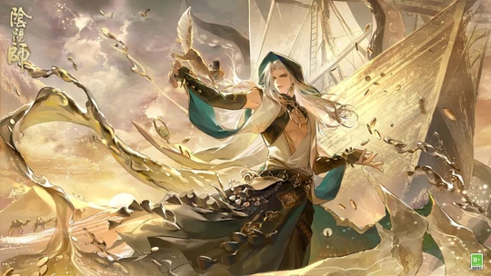 炽风卷起 流沙 ,抛起的 金币 在空中碰撞 发出悦耳的声响 黄金爪号 的 「王牌掌事人」 身着 墨绿 长袍 衣摆似有 暗金 流动 穿行于 茫茫沙海 ,探寻深藏的 珍宝