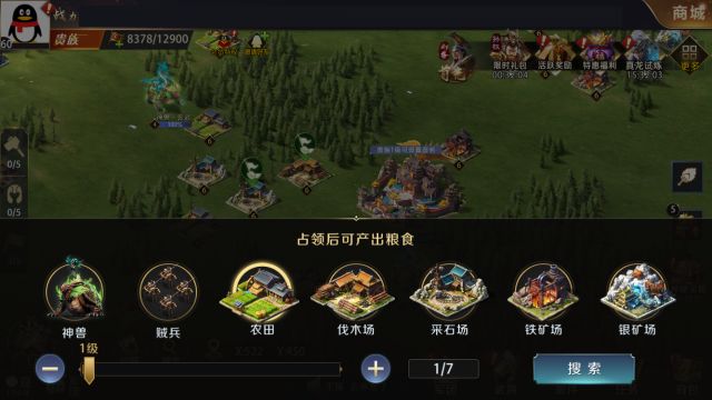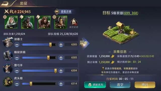 01 粮食 粮食是游戏中 最基础 的资源,不论是前期建设还是后期士兵消耗,都有着 不可或缺 的作用。 粮食的获取除了在主城外的 农田 中进行获取,还能够以占领 野外农田 的方式来获取,这种方式一般称之为采集资源。 出城后点击左下角的“搜索”按钮便可以搜索不同等级的野外农田了,最低1级,目前 最高可达到7级 。 点击“占领”后,在右侧还可以非常直观的看到当前野外农田的资源储量、采集速度和君主们预计采集量。 士兵是消耗粮食的,所以超出仓库容量的粮食除了能够被敌人掠夺外,还可能会被士兵吃掉。