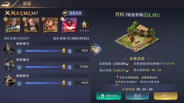 02 木材 木材与粮食一样,也是属于 最基础的资源之一 。与之对应的伐木场也分为 自产 和 野生 两种,野外伐木场也可以通过搜索来定位。而且与农田操作比较类似,野外伐木场最高等级也是7级,占领后即可进行当前野外伐木场的采集。 升级建筑 最主要消耗的便是木材了,君主们平时一定要多多囤积这种资源,确保 可持续发展 。