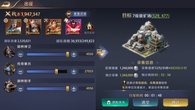 05 银币 最后一种资源便是银币了。后期作 科技研究 和 宝物锻造 对银币的消耗是非常高的。 自家的银币场供应不足,这就需要采集高级银矿场了。银矿场属于野外资源,等级从1级到7级,目前7级银矿场能采集高达126W的银币,还是相当给力的。