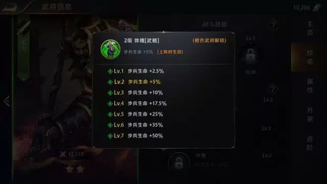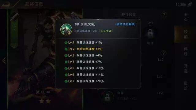 该技能对本方步兵的普攻攻击伤害提升10%,各位主公千万不要小看这10%,通过武将技能提升这10%的攻击伤害,要比提升科技要省下不少资源和钱呢,通过升级科技则需要花费大量的银币(将近10w银币),而银币更是得来不易的。如果使用该技能能节省银币的消耗,并且该技能是最终属性加成的10%,远比科技的效果10%更强。