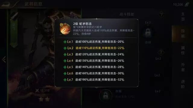 武将技能 蛇矛怒击 该技能满级的时候,张飞挥舞手中的丈八蛇矛对前方大范围敌人造成190%战法伤害,并降低敌方攻击的32%,持续4秒。该技能为AOE技能,并且在满级的时候能快速清除敌方前排,让我们部队能快速接触到敌人的后方部队,并且该技能还有降低敌方攻击的效果,在打前排的时候非常好用。并且蛇矛怒击是AOE技能,并且能快速清除敌方前排,在一场战斗的前期起着非常重要的作用。