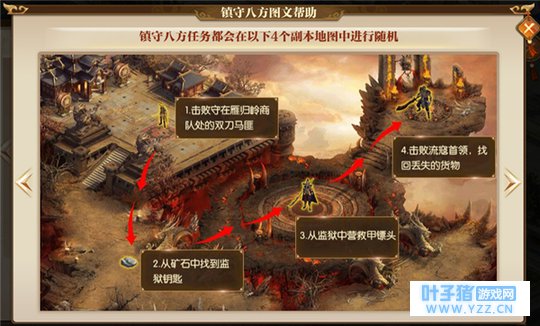 “镇守八方”根据角色等级分为多种难度,开启的副本难度不同,获得的宝箱奖励也不同,副本难度越高,通关时间越长,奖励越好。通关副本后,组内成员皆可获得贡献礼。参与战斗的玩家将获得本次副本的通关奖励,各种极品道具和丰厚好礼尽在其中。此外,根据小组成员在副本内的表现,将有额外奖励。