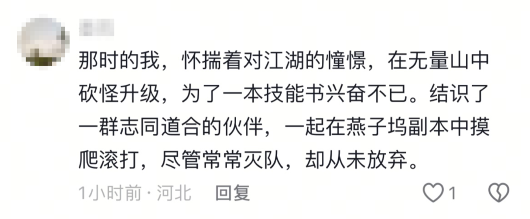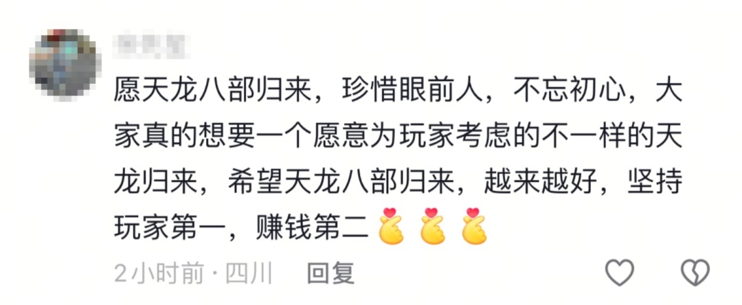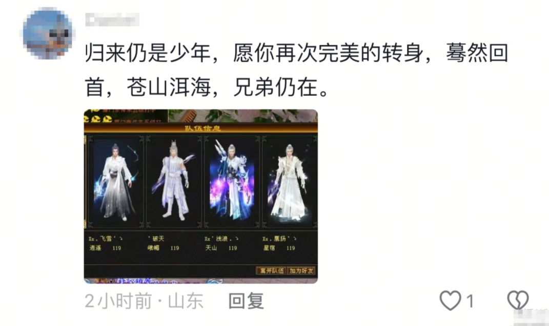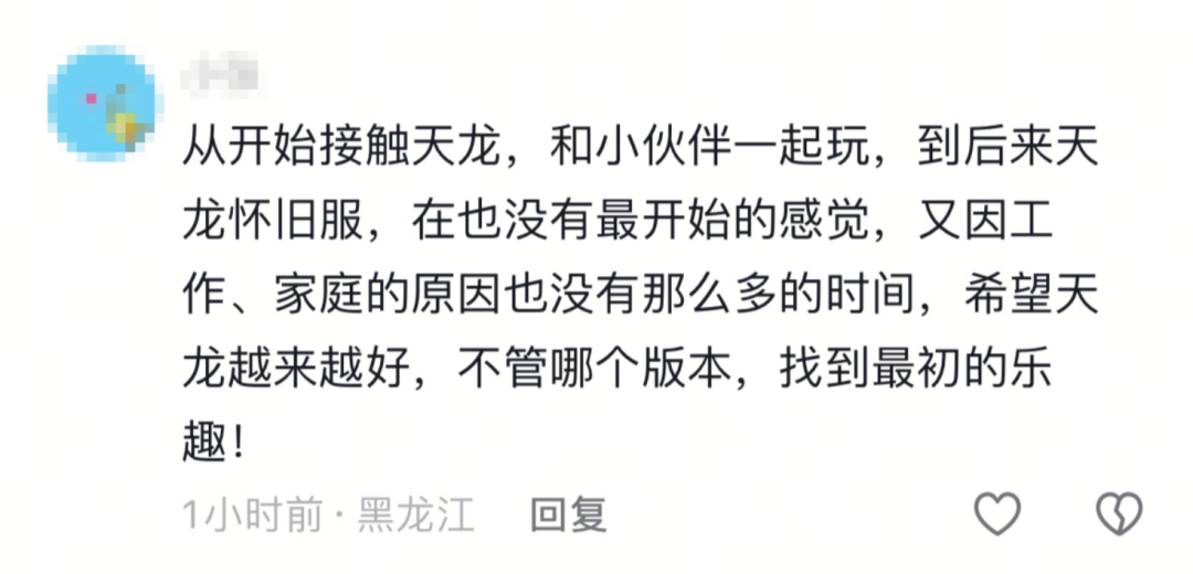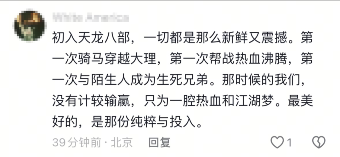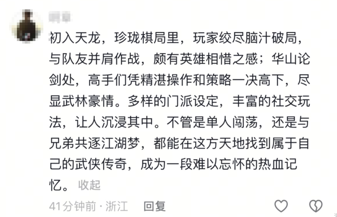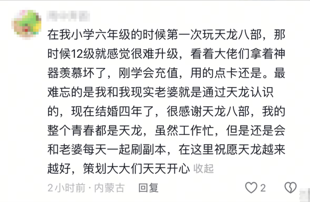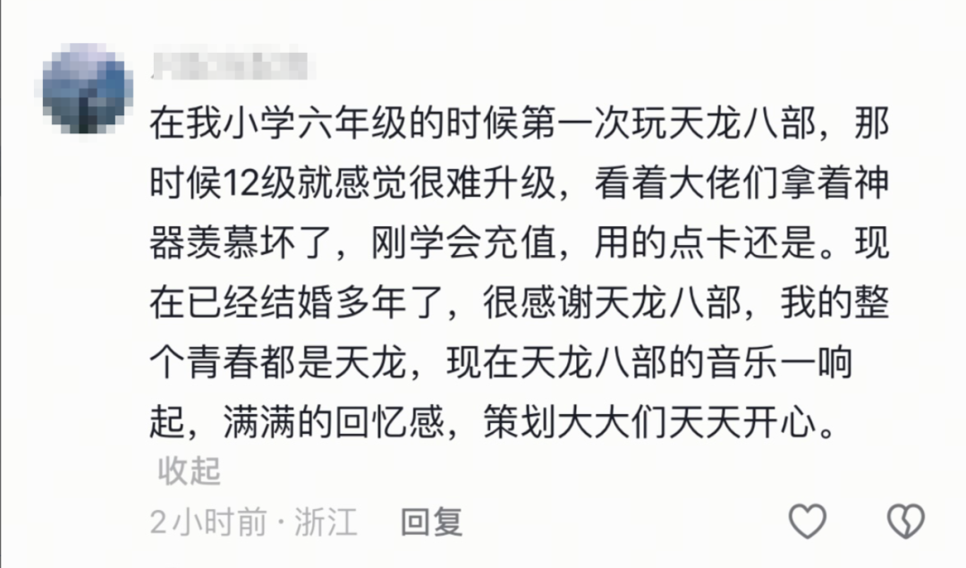 山头见日,大侠可好? 自《天龙八部·归来》开测以来,龙妹就发现了许多曾经熟悉的面孔~ 虽然天龙有很多版本,但他们都选择轻松天龙回归,当然是因为我们福利好又多,不肝不氪真减负,玩起来轻松加愉快啦~ 都说陪伴是最长情的告白,大家对天龙归来的真情,龙妹也都已经收到了。 下来让我们共同回忆一下大家难忘的曾经!江湖再会,大侠们手下留情哈—— 承载年少的热血 还记得年少时打本的初心吗,徜徉在天龙的天下,身怀快意江湖的梦。 在游戏中结交到三五知己,一起闯荡江湖,行侠仗义,热血又真诚。 是明知会输,也要拼到最后的倔强。 曾经沧海难为水,除却巫山非云也。坐不改姓行不改名,相信各位大侠的血性仍在,我们江湖再战! 难以忘怀的回忆 感动的、快乐的、悲伤的、尴尬的……想起曾经在天龙的时光,你最先想到的又是什么呢? 是守护、抓捕、打架亦或是陪伴自己游戏的人呢?念念不忘的,也是当初的自己。 我们都有着不同的回忆,但是所幸能够在【天龙八部?回归】中再次相遇。不知各位大侠是否也已经等待许久,有无前世今生的感觉呀hhh!想来在不同的心境下重温故游也是别有一番风味呢~ 跨越时空的结缘 缘分是一种奇妙的东西,千里姻缘一线牵。当初游戏中相伴的人此刻依旧在身边,天龙能够成为大家结缘的地方,真的是非常让龙妹感动呢。 在此龙妹也祝愿各位大侠能够遇见自己的正缘,要一直的幸福下去哦~ 寄托大家的祝愿 陈春杳杳,来岁昭昭。大侠们的祝福龙妹也已收到,非常感谢大家对天龙的喜爱和对我们【天龙八部?归来的】美好祝愿。 不忘初心,感恩相遇。幸好,我们还能江湖再会,一起冒险。归来会继续努力,为大家坚定地打造更美好的世界。 让我们怀揣着记忆的琥珀继续前行吧, 沉淀的微光将在游戏中, 与更灿烂的星光重逢! 老朋友,旧相逢,新故事,再开始, 期待各位大侠的加入! 有了各位的陪伴,我们的每一步都将充满意义! 编辑:月光下完美