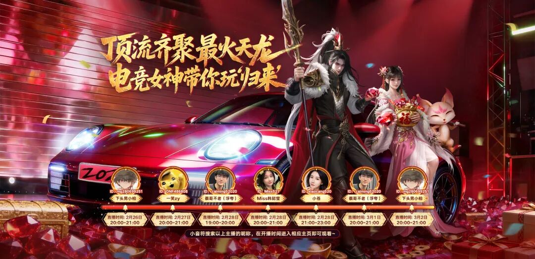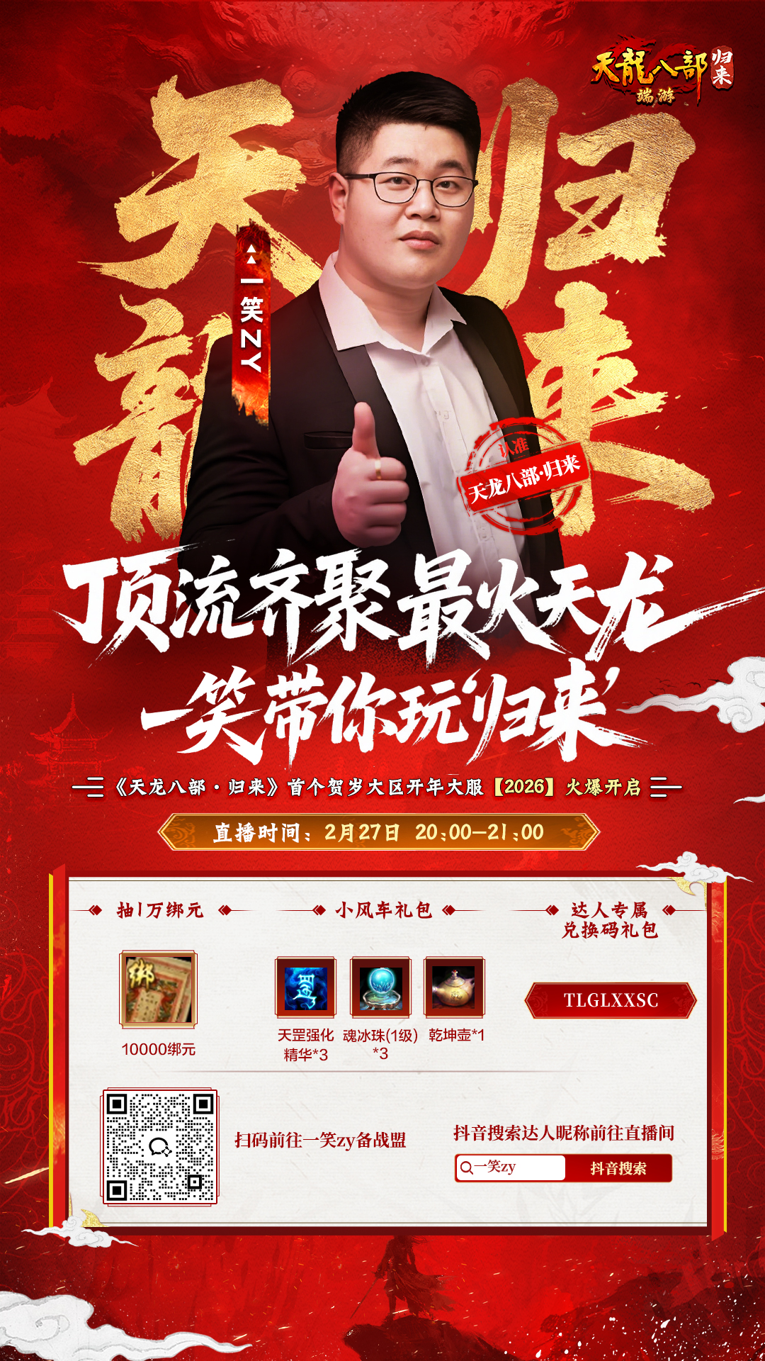 江湖风云起,战鼓震天响! 距天龙归来首个开年贺岁大服【2026】开启仅剩最后2天! 天龙知名氪佬 也是顶流人气创作者“下头男小柏”,今晚正式上线归来,在线送福利! 跨服地宫活动也将在2天后正式开启(2月28日),等级分层机制体验更公平,奖励升级,海量经验、全新奇珍异宝典藏+300%典藏掉率等你轻松爽刷! 开年百团大战也已有300余位帮主集结完毕,蓄势待发! 5名顶流主播更是组成天龙最强带玩团,誓要带兄弟们杀出一片天! 就在今晚,福利狂欢正式打响! 跨服地宫4层即将开启 2月28日 - 3月6日,为期7天的跨服秦皇地宫活动火热开启! 每天10:00-24:00,打破服务器壁垒,战火升级! 活动期间,角色等级达到10级的大侠都可以进入秦皇地宫四层,击杀怪物获取大量经验,原有的4属性典藏【帝后】和全新奇珍异宝典藏等你轻松爽刷! 活动特色: 1、跨服大乱斗:每3-4个服务器连通,对手更多,战场更大! 2、无惩罚PK:在跨服地宫四层,PK不增加杀气值! 彻底放下红名顾虑,想战就战,释放你的战斗本能! 3、精英怪争夺:新增3人组队即可挑战的精英怪,开怪后其他队伍可抢夺归属,拼手速更拼实力! 4、分层机制:地图按等级(69级、89级、90级+)分层,避免等级压制,体验更佳。 5、奖励升级:参与活动有机会获得全新的奇珍异宝典藏奖励! 3倍掉率 轻松爽刷全新典藏 典藏掉率超级翻倍!在原有的永久2倍基础上,再翻三倍! 活动时间: 2月28日(周六)版本更新后~3月8日(周日)晚24点,持续9天 并且在2月28日更新后,全新的奇珍异宝典藏将加入江湖。 大侠可通过挑战副本周宝箱结算、跨服地宫活动以及后续其他活动获得。 并可通过达成条件对奇珍典藏进行升级,解锁更多的属性加成! 龙妹提示: 【逍遥扇】目前只能通过挑战副本周宝箱获得,其他两个新典藏可通过跨服地宫4获取。 穷奇变坐骑,炫酷又帅气 什么?我的顶变穷奇还能当坐骑用?! 没错,参与活动【春启华章】有机会获得全新坐骑:玄影穷奇(永久)、全新时装:樱落春华(永久)、全新幻饰:青芜引春环(永久)。 这个春天,在天龙归来当最靓的仔! 想知道全新外观有多惊艳?大侠可直接点击下方视频,360度无死角欣赏樱落春华的唯美、玄影穷奇的霸气外露,以及青芜引春环的灵动! 活动时间: 2026年2月28日 - 2026年3月13日 活动说明: 参与活动,需要消耗道具【春翎信物】。本次活动的所有奖品,在夺宝时均有概率直接获得。 伴随每次祈愿,也有概率获得数量不等的【春华绣卷】,可用于兑换活动奖励。 详细获得概率,可在活动奖励预览界面的【奖品概率】中查看。 进入活动界面的【华章阁】,可使用春华绣卷来兑换本次活动的所有外观,更有额外的珍稀道具奖励等你带走! 累计开启,奖励加码 每次祈愿,可累计次数,每达到一定次数,可领取大量的【春华绣卷】奖励。 具体次数和领取数量如下: 累计开启10次 可获得60个春华绣卷 累计开启50次 可获得120个春华绣卷 累计开启110次 可获得130个春华绣卷 累计开启170次 可获得130个春华绣卷 累计开启230次 可获得130个春华绣卷 累计开启290次 可获得130个春华绣卷 累计开启350次 可获得130个春华绣卷 春风拂面,华章已启,正值江湖焕新颜的好时节! 快快换上新衣,骑上霸气穷奇,在江湖里留下你的惊艳身姿! 顶流集结!五大高手带你冲锋 Miss、小苍、一笑zy、浮夸、下头男小柏?这5位电竞圈与直播界的顶流大咖,已正式确认入驻天龙归来!并且也将与大侠一同踏入【2026】贺岁大服。 是与偶像并肩作战,还是在野外一较高下?机会就在眼前! 现在参与 “百团大战”冠军竞猜,预测你心中的冠亚军阵营,还可轻松赢取好礼! 所有参与竞猜玩家均可获得【金蚕丝】奖励!猜对冠军更可额外获得【乾坤壶*1】 今晚8点!下头男小柏首发开战 今晚(2月26日)20:00 - 21:00【下头男小柏】?将作为先锋,率先开启直播! 你是想看他的犀利操作,还是想听他的经典语录,看精彩节目? 定好闹钟,今晚8点,不见不散! 精彩不断档!明日一笑zy接力 今晚看过瘾了还不够? 明晚(2月27日)20:00 - 21:00 ,旭旭宝宝传媒旗下知名主播?【一笑zy】?将精彩继续! 作为旭旭宝宝传媒的门面担当,一笑zy又准备了什么狠活? 明晚8点,且看一笑zy如何整活! 2月28日,开年贺岁大服【2026】即将火热开启! MISS、小苍、一笑、浮夸、小柏五大顶流早已蓄势待发, 准备好和大佬一起闯荡江湖了吗? 精彩无需等待,今晚20:00,精彩与你相见! 编辑:月光下完美