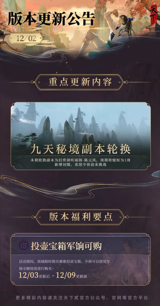 各位少侠晚上好呀~ 又到了本周的更新时间 九天秘境迎来轮换 本次副本为旧弈剑听雨阁 周期将缩短为1周 另外还新增副本词缀,欢迎少侠前往体验 后续更有九天秘境嘉年华竞速 瑞雪凛冬系列活动 跨服势力战联赛等精彩上线,敬请期待! 话不多说,下面一起来看看 本周的更新长图吧~ 本周的更新要点到此结束~ 下滑解锁更多详情细节 以下为本周公告的全部内容 具体请以官网更新内容为准 亲爱的《天下贰》玩家: 为了保证服务器的稳定和服务质量,本周例行维护将于2025年12月3日早上8:00停机,维护时间为上午8:00至10:00左右。如果在维护期间无法完成维护内容,开机时间将继续顺延。 本次更新结束后,游戏客户端版本将从2.0.1331上升到2.0.1332,更新客户端后进入游戏。请各位玩家相互转告,并留意游戏时间,以免造成不必要的损失。对于停机期间给玩家带来的不便,敬请见谅,网易游戏感谢所有玩家的支持和配合。 九天秘境副本轮换 九天云动,四象交织。为与嘉年华统计周期对齐,本期轮换副本周期将缩短为1周,周期内首通奖励不作调整。 本周维护后各服务器的九天秘境副本会产生轮换,本次轮换的副本为旧弈剑听雨阁-陈元风,同时会刷新四象之力词缀,最终首领会获得词缀[四象引·魔心]。 首领获得的主要技能介绍: 1、随着战斗的进行,首领会施展技能不断缩小战斗区域,同时每隔一段时间会以一定的门派优先级选择3-5名少侠,与其连线后,对其释放不可躲避的小角度扇形攻击。 2、首领会施展主动技能:随着战斗的进行,首领会在场中召唤水润之龙,以随机顺序释放若干个可躲避的扇形范围伤害。 3、首领会施展主动技能:随着战斗的进行,首领会以一定的门派优先级选择3-4名少侠,连续对其放置4-7波可躲避的圆形范围伤害。 4、首领会施展主动技能:首领会以一定的门派优先级选择1名少侠,突进至其位置并召唤剑域锁,剑域锁内的少侠无法离开特定区域,需要其他少侠合力击破剑域锁。 新增词缀 1、扫尾击:首领会强化自身,使自身每隔一段时间对最高仇恨少侠造成单体伤害,对相对方向背后范围施放无预警的扇形范围伤害。 2、缓扶征:首领会习得技能,周期性令一位少侠进入缓行老者状态,状态持续期间身边需持续有队友搀扶,否则移动速度越来越慢,直至无法移动。 3、灭晶:进入首领战斗后,首领会周期性在自身周围召唤灭晶,灭晶在20秒后或被攻击5次时将脚下范围变为持续存在的高伤害法术场。需控制首领位置,防止灭晶爆散影响太多战斗区域。 4、群煞鬼:进入首领战斗后,首领生命降至80%/50%/20%时召唤群煞鬼协助战斗,群煞鬼会成群出现,需要少侠通过足量范围伤害快速击杀,若未及时击杀,群煞鬼对所有敌人造成伤害。 5、广戮击:首领会强化自身技能,每隔一段时间对全场范围造成不可躲避的伤害。首领的普通攻击速度大幅提升。 问题优化 1、修复了可能出现的同队伍玩家开启副本时,提示进度不符等无法开本的问题。 2、修复了少侠登上竞速榜后,下方仍会显示未上榜的显示问题。 即将开放·九天秘境·嘉年华竞速 在本周九天秘境结束后,12月10日轮换的九天秘境副本为嘉年华竞速版本,当期的竞速排行榜将作为本年度副本名人堂的结算依据。提前预告下期嘉年华轮换副本为古皇陵三层·三元兽,各位少侠可提前“复习”攻略,研究对应打法。 为期两周进行嘉年华竞速评比 赛道1:2008、血战、莫问今朝 赛道2:天下第一、重生 《天下万象》发布会 即将开放·瑞雪凛冬经验雨 2025年12月10日更新后,将开放瑞雪凛冬限时活动,每日都有海量经验雨释放,可上线参与获取海量经验。 即将开放·瑞雪凛冬 2025年12月10日更新后即将开放童年雪场等瑞雪凛冬系列活动。 参与将获得时装外观、数值道具等珍稀奖励。 预告·跨服势力战联赛 跨服势力新联赛已经在紧锣密鼓的开发中,此玩法本月就将进行正式开放或测试,和大家见面。 目前正在收集建议阶段,会提前和喜欢激情战斗的少侠们进行开发阶段沟通,随时调整优化玩法内容。 雅歌投壶·小额礼包 活动时间 2025年12月3日维护后~2025年12月9日23时59分59秒 活动内容 商城限时推出雅歌投壶宝箱·壹、雅歌投壶宝箱·贰、雅歌投壶宝箱·叁,可全额用军饷购买。 雅歌投壶宝箱·壹: 开启后必得宝匣之佑*10,概率获得以下禁交易道具:风雅颂*50、风雅颂*100、风雅颂*150、风雅颂*200、风雅颂*300、风雅颂*500、风雅颂*1000。每人限购5份。 雅歌投壶宝箱·贰: 开启后必得宝匣之佑*10,概率获得以下禁交易道具:风雅颂*300、风雅颂*500、风雅颂*800、风雅颂*1200、风雅颂*3000、风雅颂*5000。每人限购5份。 雅歌投壶宝箱·叁 开启后必得宝匣之佑*10,概率获得以下禁交易道具:风雅颂*500、风雅颂*1000、风雅颂*2000、风雅颂*5000。每人限购5份。 体验优化 增加几种门派食物药品的叠加上限。 优化了九天首饰套装技能的状态显示: 新增了蓄势、猛击技能的冷却时间标记。 折叠状态栏后,蓄势、猛击的层数也能正确显示。 本周更新后,修复了匹配天下联赛和竞技场,窗口缩小的问题。 竞技场组排功能修复 我们收到少侠们的反馈,竞技场存在利用组排模式漏洞异常上分的问题,经查证该情况属实。我们暂时在线关闭了竞技场组排功能,本周三更新修复后再重新开放。对被此漏洞影响到的少侠我们深表歉意,后续会整理利用漏洞开启的场次,并对异常角