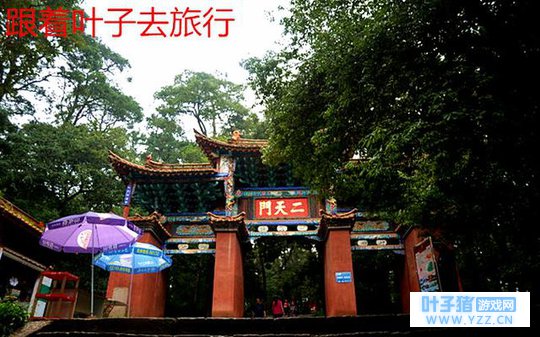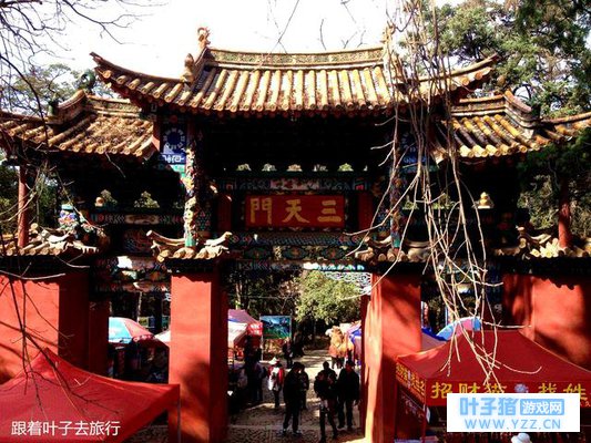 一天门 金殿主要景点有一天门、二天门、三天门、棂星门、太和宫、金殿、三丰殿、秋园、钟楼、环翠霞琦宫等道教建筑以及金殿博览、茶花园、花圃等设施。金殿风景区修建了一个“中国金殿博览苑”, 荟萃了湖北武当山、山西五台山、山东泰山、和北京万寿山的铜建筑,还堆了大理石、小桥叠水、踏步栏杆、栈道石坊、植物花卉等景观相映,形成了小巧玲珑的仿铜文化园林。金殿拥有500亩园林植物园,引种园林植物2000余种,分为茶花园、杜鹃园、木兰园、蔷薇园、温室区等十个园区,园中有两株杆象导弹的董棕尤其抢眼。