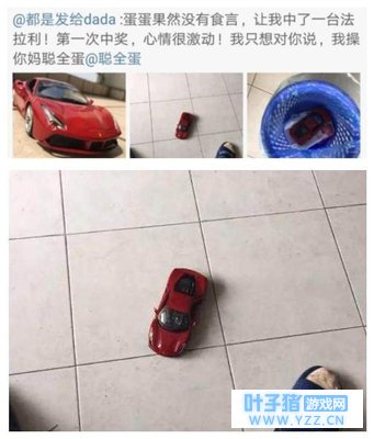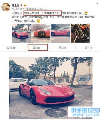 这个许多玩家梦寐以求的机会被一个16岁的高中生获得了,从最开始的不相信自己中奖,到确认可以和艳星共度良辰,这位高中生愉快地顶着双亲和姐姐的压力领取了奖项,虽然不知他会不会因为年龄而无法“使用”奖品,但这运气和“奖品”还是非常独特的! 游戏主播——法拉利不开送人了这位名叫聪全蛋的游戏主播,某日在微博上称:自己的法拉利不想开了,想换台布加迪,旧车就直接在微博上作为奖品送给玩家,并让微博官方公正。玩家们一听十分兴奋,纷纷转发参与抽奖。可是结果……