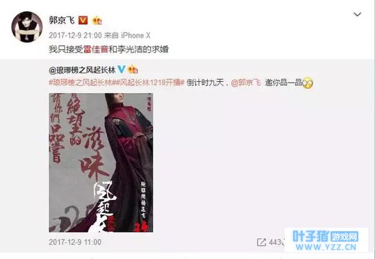 李光洁在微博上分享了一张雷佳音的照片,雷佳音随即转发宣布出柜。