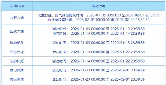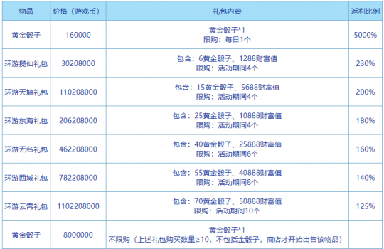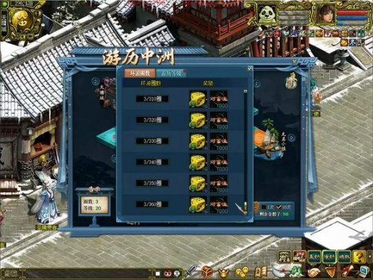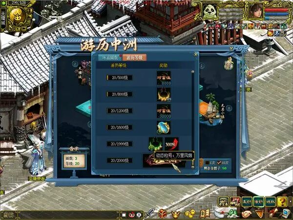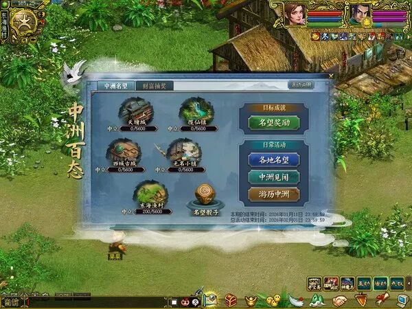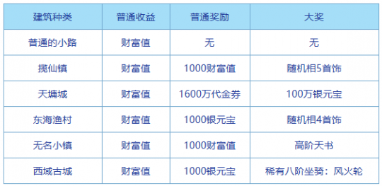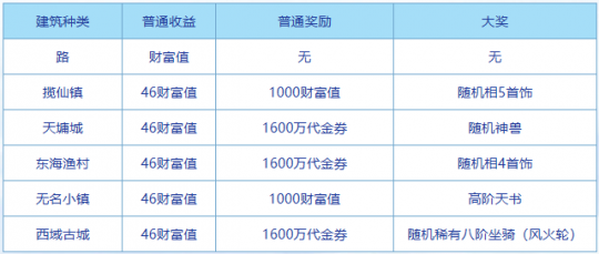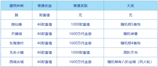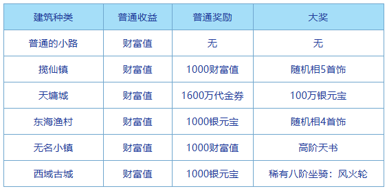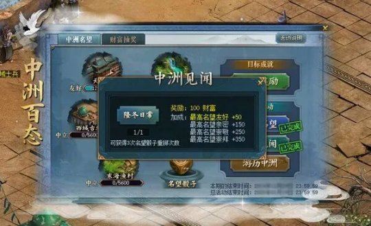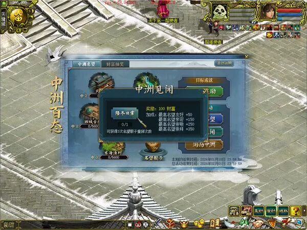 银装素裹,瑞雪兆丰年;道法自然,问道又一冬。 隆冬节主题活动来袭!全新神兽——九幽素女惊喜加入普通版、经典版、时间版活动奖池!普通版还有元灵哪吒助阵!丰厚福利已备齐,只待君来共赴这场冰雪仙缘! 普通版·隆冬节(中洲百态) 各地名望 活动以每周为一期,持续开启四期;每个周期内,角色等级≥60级的玩家完成各地名望任务,可获得对应名望值奖励,且每完成一个名望任务可获得1次投掷名望骰子次数和2次重掷次数; 掷名望骰子,根据图案组合获得对应某地的名望值;可以通过勾选要重掷的骰子,修改获得声望的城市。注意:图案顺序不影响名望获得。 当名望值累计到一定值,可提升当地名望阶段;每达到一个阶段后,可点击领取阶段相应的奖励:道具奖励、限时300天称谓奖励等。 天墉城: 兵马使 威远节度使 揽仙镇: 饱学之士 士林魁首 西域古城: 流沙商贾 商贾大亨 无名小镇: 独行侠 侠之大者 东海渔村: 蓑笠翁 东海船长 每个周期结束,系统会自动重置名望值,同时每期结束后3天为领奖时间,领奖期间玩家可以通过捐赠的方式提升名望至下一阶。捐赠的内容可以是财富、银元宝、金元宝等。比如当前名望等级为亲密,可通过捐赠提升至崇敬,如当前为崇敬可提升至崇拜,但不可跨阶提升,比如:不能从友好提升到崇敬,不能从亲密提升到崇拜。 中洲见闻 活动期间,角色等级≥60级的玩家完成每日中洲见闻日常任务,可以获得相应的财富值,财富可用于抽奖;随玩家名望越高,可以获得财富越多。 最高名望达到友好,可以额外获得50点财富值;最高名望达到亲密,可以额外获得150点财富值;最高名望达到崇敬,可以额外获得250点财富值;最高名望达到崇拜,可以额外获得350点财富值。 注:强烈建议先完成各地名望任务,后完成中洲见闻任务,以便提升名望等级后可获得更多财富奖励! 每期结束时都会重置名望,但不重置财富;超出崇拜上限的名望会转化为财富;使用财富值可前往财富抽奖切页参与抽奖;在中洲名望切页右上角【活动说明】按钮,可查看抽奖概率。 财富值可以用于参与“财富抽奖”有机会获得元灵-哪吒、神兽-姑射仙子、变异-姑射师姐、八阶坐骑-混世大荒、全新神兽:九幽素女宠物大奖和稀有道具奖励。 哪吒(元灵) 天生技能:十万火急、游说之舌、死亡缠绵 成长: 九幽素女(全新神兽) 相性:土 天生技能:鞭长莫及、游说之舌、神龙罩 成长: 游历中洲 活动期间,角色等级≥60级的玩家点击右上角的【游历中洲】活动小图标; 活动开始时,角色于起点起始,根据黄金骰子投掷的点数,顺时针进行行走,前进格数为投掷的点数;当玩家再次经过起点,则记录玩家圈数+1;根据行动的圈数,可以获得不同的奖励。(参与消耗的黄金骰子,玩家可以在【商店】进行购买。) 投掷并移动到建筑后,根据该格子的建筑等级给予玩家相对应的奖励;若建筑等级小于100级,建筑等级+1。注:当总建筑等级升级至1999级,建筑财富值的收益提升至400%。 风火轮(坐骑) 天生技能:十万火急、游说之舌、死亡缠绵 成长: 【经营等级】 为玩家在活动期间,各建筑等级的总和,对应奖励如下: 动态称谓奖励:万里风烟 经典版·隆冬节(中洲百态) 各地名望 隆冬节活动共有4期,每7天为一个周期;每个周期内,完成各地名望任务和中洲见闻提升主城:天墉城、揽仙镇、西域古城、无名小镇和东海渔村的名望。(主城名望最低可降至0。) 等级≥60级的玩家可以参与投掷名望骰子,根据图案组合获得对应某地的名望值。每完成一次【各地名望】任务,可获得1次投掷名望骰子的次数和2次重掷次数。名望到达崇敬、崇拜阶段还可获得对应限时300天称谓奖励。 天墉城: 兵马使 威远节度使 揽仙镇: 饱学之士 士林魁首 西域古城: 流沙商贾 商贾大亨 无名小镇: 独行侠 侠之大者 东海渔村: 蓑笠翁 东海船长 每期结束时都会重置名望、名望骰子次数和名望骰子的名望,但不重置财富值;超出崇拜上限的名望会转化为等量的财富值。每个周期结束后3天内为领取奖励时间,玩家在领奖时间内可使用财富值、金银元宝进行捐赠,将地区名望提升至下一名望阶段。 中洲见闻 活动期间,点击中洲见闻可查看当天的日常任务,领取并完成隆冬日常任务,可以获得财富值奖励和3次名望骰子重掷次数。 完成每日中洲见闻任务,可获得基础任务奖励100财富值,财富可用于抽奖。玩家名望阶位越高,可以获得额外财富值就越多!最高名望达到友好,可以额外获得50点财富值;最高名望达到亲密,可以额外获得150点财富值;最高名望达到崇敬,可以额外获得250点财富值;最高名望达到崇拜,可以额外获得350点财富值。 建议玩家先完成各地名望任务后再参与隆冬日常任务,以便提升名望阶位后可获得更多财富奖励! 完成隆冬日常任务同时扣除助人为乐任务次数,并获得活跃度奖励,使用五雷令完成助人为乐任务时同步完成隆冬日常任务。 财富值可用于“财富抽奖”,有几率抽取到稀有8阶坐骑“混世大荒”、神兽“姑射仙子”、“九幽素女”等稀有奖励。 九幽素女(全新神兽) 相性:土 天生技能:鞭长莫及、游说之舌、神龙罩 成长: 游历中洲 活动期间,角色等级≥60级的玩家点击右上角活动图标进入活动界面。 点击商店可以购买黄金骰子以及返利礼包,礼包内含海量黄金骰子和财富值,玩家购买10个礼包(每日返利黄金骰子不算在内)后,可单独购买普通黄金骰子,