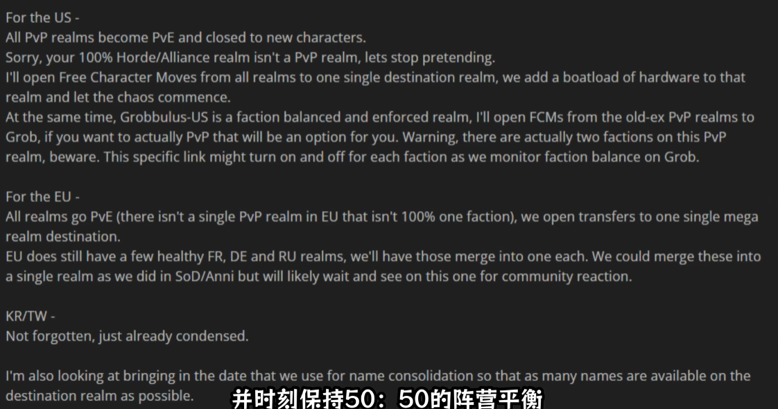 你还记得第一个选择的魔兽服务器吗?它是单边服呢,还是已经变成鬼服了。记得很早以前,就有不少玩家向暴雪提议合服来解决服务器人少的问题,可是这个方案一直没有通过。但在最近突然传来好消息,暴雪终于把合服的问题提上了日程,魔兽世界史无前例的超级合服要来了! 据悉,早在2024年末,负责怀旧服的团队曾有一个大胆的想法,他们要把怀旧服所有服务器都合并为一个超大服务器,类似于20周年纪念服。相信以暴雪目前的技术,要想实现这个计划绝非难事。 对此,玩家有个疑问,既然有这方面的想法,为何迟迟不实现呢?团队负责人解释说:“单是持续更新当前版本内容就耗尽我们大部分时间,要想快速推进这个项目可太难了,但此前我们成功地在一个服务器上运行了怀旧服Plus和周年服,不排除熊猫人怀旧服也这样做”。 除此之外,负责人还聊到魔兽世界未来合服的大方向,暴雪计划把美服和欧服所有PVP服转为PVE服,并且禁止创建新角色,同时允许玩家免费转到一个超大服。至于PVP服,只留下一个用作测试新模式,在里面会强制50:50的阵营平衡,持续监控联盟与部落的数量,力求做到双方人数持平,不会出现20个部落追杀1个联盟的情况。 对于这个新模式,暴雪是基于长期的观察与实践得出来的最终方案,他们发现玩家对PVP玩法并没有那么的狂热,大多数玩家还是偏爱跟小伙伴体验PVE内容。另一方面,从正式服与怀旧服的数据来看,刚开始部落与联盟的人数是相差无几,但随着其中一边出现大公会或小势力时,这种平衡就极容易被打破,弱势的一方不想受此委屈就会选择转服,极端情况下会出现10:90乃至1:99的阵营比例,这种情况到了TBC尤其明显。 虽然后续版本推出“战争模式”来缓解这个情况,但由于部落人数较多,最终导致一个地图上仅有的40名联盟被200名部落追着打,尽管暴雪多次修改但还是无法弥补阵营比例失衡这个大坑。 直到怀旧服Plus,强制采用50:50的阵营比例却发现效果出奇的好,这也是未来魔兽对服务器进行改动调整乃至合服的主基调,现在的PVP服务器已经名存实亡。至于国服是否会合服,负责人并没有提及。小伙伴们对于超级大服怎么看呢?欢迎在下方留言分享。 编辑:月光下完美