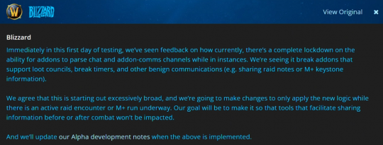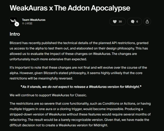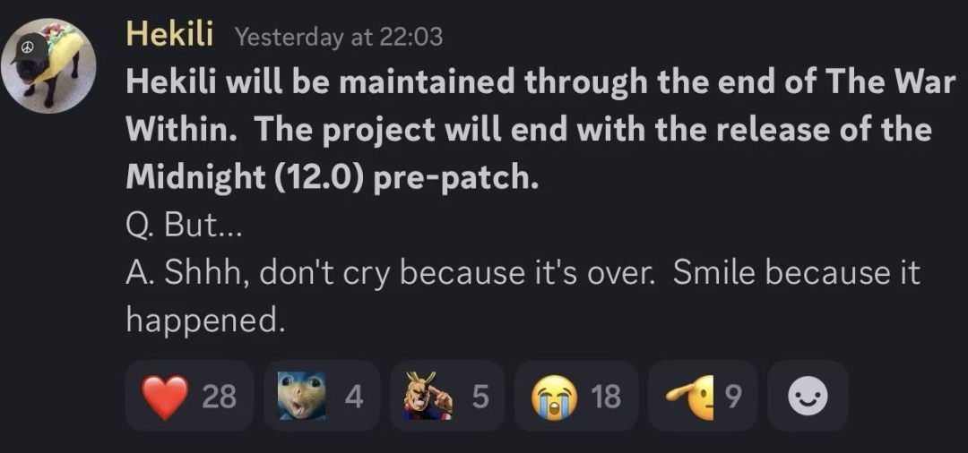 万万没想到,在WA团队宣布全面停止对魔兽12.0的支持之后,另一款神级插件Hekili的制作团队也开摆了!近日,Hekili官号也发布相关消息,称该插件会随着魔兽12.0的发布而无限制停更,感谢玩家一直以来的支持。 有关这个打地鼠的Hekili插件,相信很多老玩家都十分熟悉了,该插件会根据SIMC模拟的最佳输出手法,针对AOE与单体环境给玩家提供输出的最佳方案。对于刚上手新专精不清楚循环的玩家来说,使用Hekili可以帮助他们快速上手,锻炼出肌肉记忆。因此,哪怕是争夺世界首杀的顶级团队,也有部分成员会使用这个插件。 但跟WA团队面对的问题如出一辙,因为暴雪的“口是心非”,让游戏内本该被限制部分信息的战斗信息接口被一刀切了,导致Hekili也无法读取战斗环境的信息,灵活地给玩家做出指导。因此,Hekili也是抱着与其做个二流插件,还不如停更的想法直接跟暴雪爆了。 而在此前,WA团队也是指出,由于暴雪将所有战斗信息全部关闭的关系,导致插件连玩家的个人战斗信息都无法检测。如果按照目前的情况,他们要花好几个月的时间去重新制作新的WA插件,而且无法保证新的插件就能适配正式公测的版本。所以,对于所有插件作者来说,这都是一项无法被接受的庞大工程。 对此,暴雪也是作出了部分的让步,开启了战利品分配、装备查询、团队备注就位确认等信息的端口,允许插件可以正常运行。只不过,这些功能不论是对于插件研发团队,还是对于玩家来说,也都是杯水车薪了,完全无法改变目前的局面。所以,美服喷子在这两天也开始在论坛上讨伐暴雪,声称如果WA、Hekili真停更了,那他们就卸游戏了。 说实话,插件的存在与否,对于《魔兽世界》从来都不是问题。现在的问题在于,哪怕是在12.0 A测中间,由暴雪官方亲手推出的战斗监控插件,也无法监控饰品与套装的触发效果,远不如民间插件好用。所以,如果暴雪真要一刀切,那么必然会影响大量玩家的游戏体验。 编辑:叶子猪小秘书