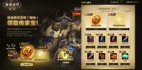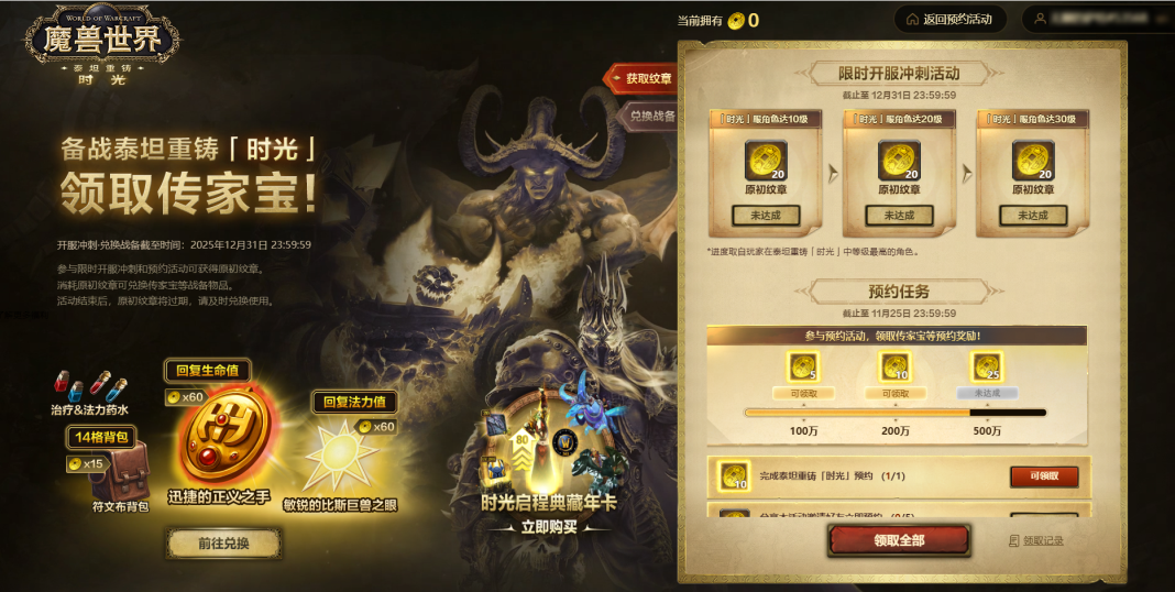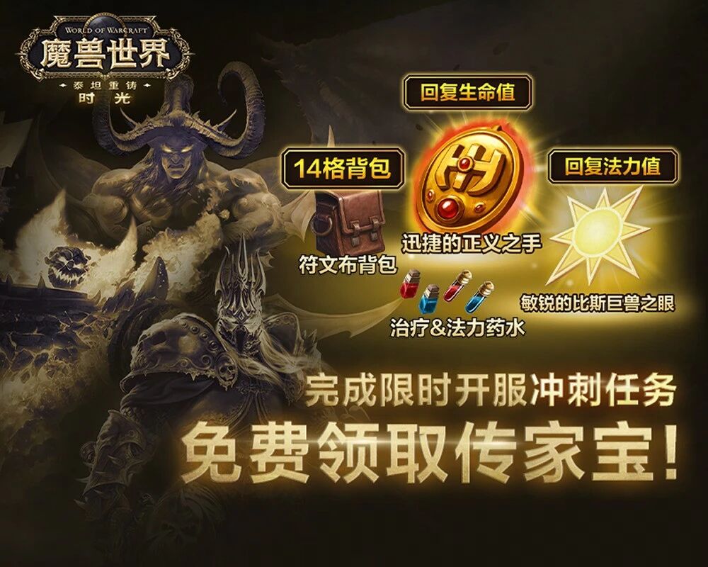 泰坦重铸服务器「时光」抢先体验已正式开启! 此刻,所有拥有抢先体验资格的冒险者都可以进入游戏,在这片既熟悉又崭新的大陆上谱写属于自己的传奇。 时光在此凝滞,史诗于此交汇,经典团本,此刻共存。 12月4日,泰坦重铸服务器「时光」第一阶段将正式开启! 熔火之心是炎魔之王拉格纳罗斯的领地——昔日危机四伏的炽热之地,如今将以全新的形态,等待着新的勇士直面其怒吼的熔岩。 致敬永恒的经典,你是否准备好,踏入这片既熟悉又陌生的炎魔之王沉睡之地,成为时光回响中的开拓者? 预约奖励现已开放兑换 预约奖励兑换通道今日同步开启!完成官网及小程序预约任务的玩家,可前往活动页面领取原初纹章,即刻兑换传家宝、14格背包、补给品等开服必备物资。 *测试环境,以实际上线页面为准。 *除迅捷的正义之手/敏锐的比斯巨兽之眼之外,其余物品需先前往泰坦重铸服务器「时光」创建角色。 *物品发放存在一定延迟,请耐心等待。 奖励兑换截止至2025年12月31日,切勿错过备战良机,为你的冒险之路保驾护航。 等级冲刺,赢取额外传家宝 为了庆祝服务器开启,全新的等级冲刺活动现已启动!当您的角色等级成功达到10级、20级与30级这三个重要里程碑时,均可分别在预约活动页面完成任务获取20个原初纹章。 任务条件 奖励内容 「时光」服任意角色达到10级 原初纹章*20 「时光」服任意角色达到20级 原初纹章*20 「时光」服任意角色达到30级 原初纹章*20 这意味着,积极提升等级的勇士总计可额外获得60个原初纹章!您可在预约活动页面使用这些纹章,额外兑换一件心仪的传家宝,让您的冒险之旅从一开始就快人一步,赢在起跑线上。 *测试环境,以实际上线页面为准。 预约活动目前仍在持续进行中,2025年11月25日23:59:59前,前往《魔兽世界》官网与小程序完成预约,完成预约任务,参加等级冲刺活动,赢取原初纹章,兑换传家宝、14格背包、补给品等奖励! 泰坦重铸服务器「时光」 泰坦重铸无敌坐骑即将抵达 备受期待的【泰坦重铸无敌】坐骑预计将于11月25日起陆续发放至符合条件的玩家账户。 即刻起,您可以登录预约活动页面,查询获取资格,只要您在11月25日23:59:59前,在怀旧服主线服务器击败1次任意规模任意难度的冰冠堡垒最终首领“巫妖王”,即可获取这一属于勇士的荣耀见证。 *【泰坦重铸无敌】仅适用于泰坦重铸服务器「时光」 怀旧服主线服务器商品同步 泰坦重铸服务器「时光」上线后,怀旧服主线服务器中的部分商品(包含但不限于:金色炽焰凤凰、萨巴卡的青睐宠物等)暂时无法获得,我们将在近期逐步将怀旧服主线的全部商品同步至泰坦重铸服务器「时光」。 此外,国服回归后所有活动中赠送的怀旧服主线服务器的奖励也将在近期同步至「时光」服,如:火箭鸡(宠物)、骑乘乌龟(坐骑)等。 预下载现已开启 泰坦重铸服务器「时光」预下载现已开启,如果您尚未安装游戏,请按照以下步骤进行游戏的下载与安装: 下载并安装战网桌面应用。 启动战网桌面应用并登录你的战网通行证账号,选择左上角“偏好”中的“魔兽世界(经典怀旧服)”图标。 如果无法找到该图标,请点击“偏好”最右方的“+”按钮,将游戏添加至偏好。 在左下角的“游戏版本与账号”中选择怀旧服—泰坦重铸,并点击安装按钮。 安装完成后,按钮将变为灰色的“进入游戏”按钮。泰坦重铸服务器「时光」开服后,点击该按钮将启用并可以点击启动游戏。 特别提醒 购买【时光启程补给包】以后,玩家需要完全退出游戏,重新登录角色后在背包中查看。 此时此刻,无数传说正在书写,更多奇迹等待缔造。召集你的战友,握紧你们的武器——全新的史诗正等待你们共同铸就! 编辑:月光下完美