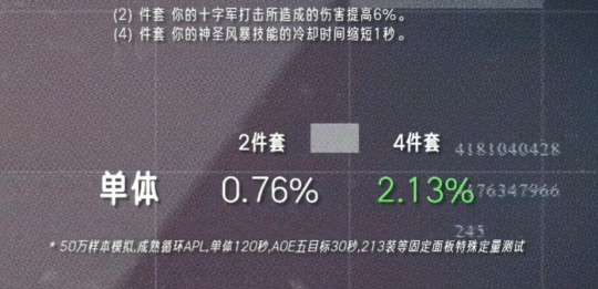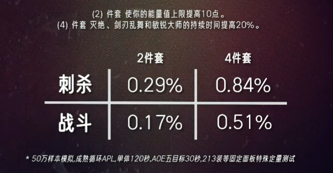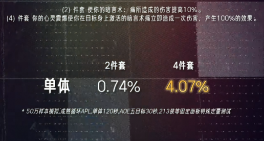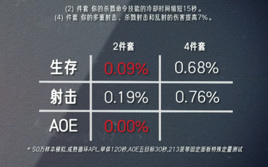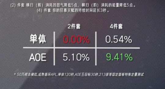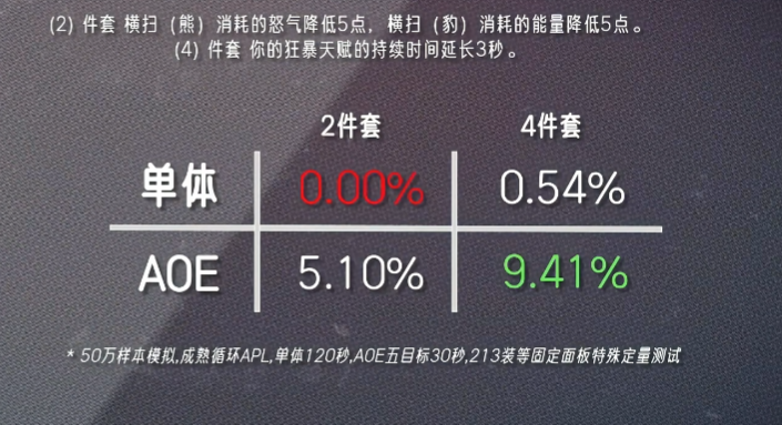 魔兽时光服距离开放团本只剩一周时间,不少玩家都很好奇,原本60级的T1套装在经过暴雪重制后究竟有怎样的变化,尤其是DK这个职业,因为现在大家都十分看好邪DK能登顶P1。而在最近,坊间就有一名大神根据T1套模拟出各大职业的输出情况,下面一起来看看吧。 据数据大神“财高八抖”测试的结果来看,T0仅有鸟德和暗牧,其次是火法、奥法和惩戒骑,其余职业专精统一归类到T3挡,其中猫德在拿到四件套之后仅有0.54%的提升,排最后一位。当然,首发猫德的玩家也不必过于担心,因为官方早前说过会根据每个职业的DPS强弱来进行调整,更何况魔兽世界向来流传一句话:没有最强职业,只有最强玩家。 以下是各职业T1套装效果以及DPS提升情况: 德鲁伊(塞纳里奥) 猫德(DPS+0.54%) 2件套效果:【横扫(熊)】消耗的怒气降低5点,【横扫(豹)】消耗的能量降低5点。 4件套效果:【狂暴】天赋的持续时间提高3秒。 鸟德(DPS+3.91%) 2件套效果:【自然之力】天赋召唤的树人数量提高1个。 4件套效果:【星辰坠落】天赋的持续时间提高2秒。 死亡骑士(北境) 邪恶(DPS+0.78%) 冰霜(DPS+0.98%) 2件套效果:【寒冬号角】在使用时额外产生5点符文能量。 4件套效果:【凋零缠绕】和【冰霜打击】造成的伤害提高5%。 猎人(巨人追猎者) 生存(DPS+0.68%) 射击(DSP+0.76%) 2件套效果:减少【杀戮命令】技能冷却时间15秒。 4件套效果:【多重射击】【杀戮射击】【乱射】技能提高伤害7%。 法师(奥术师) 火法(DPS+3.11%) 奥法(DSP+1.3%) 霜火(DPS+0.37%) 2件套效果:你的法术命中几率提高1%,法力值消耗降低1% 4件套效果:你从自己的专注魔法效果中获得的暴击几率提高2% 牧师(预言之影) 暗牧(DPS+4.07%) 2件套效果:【暗言术:痛】法术伤害提高10%。 4件套效果:【心灵震爆】会使你对目标施放的【暗言术:痛】立即造成一次伤害,效果为100%。 术士(恶魔之心) 痛苦(DPS+0.63%) 恶魔(DSP+1.11%) 2件套效果:宠物造成的伤害提高5%。 4件套效果:使用生命分流之后,可以使下一次【暗影箭】【烧尽】或者【灵魂之火】的蓝耗降低10%,并提高其10%伤害。 圣骑士(秩序之源) 惩戒骑(DPS+2.13%) 2件套效果:【十字军打击】所造成的伤害提高6%。 4件套效果:【神圣风暴】技能的冷却时间缩短1秒。 盗贼(夜幕杀手) 刺杀(DPS+0.84%) 战斗(DPS+.0.51%) 2件套效果:增加10点最大能量值。 4件套效果:使【灭绝】【剑刃乱舞】【敏锐大师】的持续时间增加20%。 萨满祭司(大地之怒) 元素装(DPS+0.86%) 2件套效果:【元素专注】天赋降低法术消耗的效果提高5%。 4件套效果:【连锁闪电】法术爆击几率和伤害提高5%。 增强(DPS+1.20%) 2件套效果:【乱舞】天赋强化的攻击次数提高1次。 4件套效果:【静电震击】天赋激活的几率提高2%。 战士(力量) 狂暴(DPS+0.91%) 武器(DPS+0.69%) 2件套效果:【猛击】和【旋风斩】的技能伤害提高3%。 4件套效果:激活【血涌】的几率提高5%,激活【猝死】的几率提高2%。 总的来讲,各个职业的T1套效果并没有重制得很强,但也符合暴雪“低开高走”的思路,毕竟后面还有好几个套装,随着开放的阶段其套装效果必然会越来越强,最为关键的是玩家能自行搭配每种套装,可玩性大大增加。 编辑:月光下完美