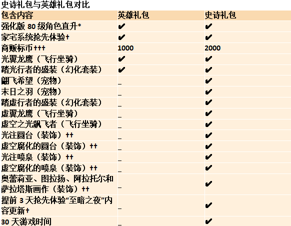 准备好在北京时间2026年3月3日上午7:00全球同步上线的《魔兽世界?》“至暗之夜”内容更新中,直面“先驱”萨拉塔斯与虚空大军。 已购买“至暗之夜”英雄和史诗礼包的玩家更可从2025年12月4日起,抢先体验家宅系统。 北京时间12月4日, 通过家宅系统抢先体验安家落户! 随着“至暗之夜”序章内容更新“幻世警钟”的上线,已拥有“至暗之夜”英雄和史诗礼包的玩家将能通过家宅系统抢先体验加入一个住宅区、选择一处住宅,并开始自定义你的新家! 假如还未拥有也不用担心,你仍然可以通过多样的活动和成就,或从艾泽拉斯各处的商人那里购买,来开始充实你的住宅物品收藏。阅读此前发布的文章,了解更多信息。 你在艾泽拉斯的新家正等着你! 入手“至暗之夜”数字礼包 冒险之旅唤你回家 增强游戏体验 预购《魔兽世界》:“至暗之夜”史诗版,为冒险旅程解锁一系列好礼! 家宅系统抢先体验 准备好在“幻世警钟”内容更新中安居乐业,开始设计你在艾泽拉斯的梦中家园。拥有家宅系统抢先体验资格,即可率先体验这一全新功能——在家宅系统完整功能于“至暗之夜”内容更新上线前,你可以收集部分藏品,自由探索、定制与装饰你的家园。 “至暗之夜”住宅装饰 为你在艾泽拉斯的家换上“至暗之夜”主题的装饰,包括光注圆台、虚空腐化的圆台、光注喷泉、虚空腐化的喷泉,以及四位标志性角色的画作。 虚空之光飙飞者 让虚空之光飙飞者飞行坐骑载你腾飞,以独特的视觉效果改变外观,将圣光和虚空的力量集于一身。 强化版80级角色直升 强化版角色直升助你备战“至暗之夜”,准备开始奎尔萨拉斯的升级旅程。 幻化,坐骑,宠物,更多好礼! 获取踏光行者和踏虚行者幻化套装,光翼和虚翼龙鹰飞行坐骑,末日之羽和翩飞希望龙鹰宠物,额外的商贩标币,以及30天游戏时间。 选择你的礼包 史诗礼包: 史诗礼包包含英雄礼包的全部内容,还有多项额外福利。你还将获得“至暗之夜”提前3天抢先体验的资格,以及30天游戏时间。 该礼包包含翩飞希望和末日之羽宠物、虚翼龙鹰飞行坐骑、具有动态变色效果的虚空之光飙飞者飞行坐骑,以及踏虚行者的盛装幻化套装。 另外,你还能获得“至暗之夜”住宅礼包,内容圆台、喷泉和标志性角色的画作装饰,用它们定制你在艾泽拉斯的家园。你还能获得2000枚商贩标币,可以在商栈使用。 英雄礼包: 该礼包包含家宅系统抢先体验资格,一次附赠升级装备和声望进度的强化版80级角色直升,光翼龙鹰飞行坐骑,以及踏光行者的盛装幻化套装,用于定制你的角色。另外,你还能获得1000枚商贩标币,可以在商栈使用。 史诗礼包与英雄礼包对比 *游戏内物品与80级角色直升不可在《魔兽世界》经典怀旧服游戏中使用。强化版80级角色直升仅适用于购买或领取该礼品的《魔兽世界?》游戏账号。 ?“至暗之夜”抢先体验和家宅系统抢先体验的上线日期可能改变。“至暗之夜”抢先体验的最短时间为3天。限时有效。实际游玩时间可能受到停机维护和适用时区差异的影响。“至暗之夜”和家宅系统的部分内容不会在抢先体验期间开放。 ??家宅系统抢先体验预计在11.2.7内容更新中开始。住宅装饰物品将在11.2.7内容更新期间提供,拥有抢先体验资格即可使用。 ???商贩标币只会在每个战网?通行证第一次购买各个版本时获得,最多可以获得2000枚标币,来自史诗礼包。 关于“至暗之夜” 在“至暗之夜”中,随着艾泽拉斯的世界将陷入凶险的境地,玩家将踏入新三部曲的下一个篇章。先驱萨拉塔斯已然成为我们最大的威胁。她率军直击血精灵的故乡,深入永歌森林的心脏,所到之处一切都陷入了混乱。 在闪耀的精灵王国奎尔萨拉斯的上空,一场虚影风暴已经浮现,企图熄灭所有光明,使整个世界在黑暗中沉沦。玩家将升至最多90级,探索焕然一新与首次现世的四个区域,揭露萨拉塔斯阴谋的核心,在交织的光影中寻觅新的盟友。 “至暗之夜”升级和区域 探索四个焕然一新的新区域,深入了解不断发展的故事,结交新的盟友,积累力量并击退虚空。 永歌森林 沉浸于焕然一新的永歌森林,感受画质升级为这片血精灵故土带来的勃勃生机。这片区域融合了原有的永歌森林与幽魂之地,版图经过小幅扩展后与东部王国接壤。玩家能够使用驭空术翱翔天际,无需读取时间即可穿越区域,从高空俯瞰血精灵建筑的闪耀尖塔与金色林海交相辉映的壮丽景象。 祖阿曼 阿曼尼巨魔栖居于其都城祖阿曼,是血精灵喜怒无常的邻居。他们是一个自豪的民族,为守卫自己的领土浴血奋战,克服过许多艰难险阻。这片土地由苍翠古林与巍峨山脉交织而成,时常骤雨倾盆。当你探索这片区域时,将得以深入了解其文化与历史。 哈籁恩达尔 哈籁尼尔的故乡是一片真菌丛林,也是世界之树的根须交汇的地方。哈籁尼尔可以穿越林根之路前往世界各地,他们暗中观察着艾泽拉斯的一切,却从不公然介入世事。艾林裂隙横亘于该区域中,这道原始伤痕使梦境与现实的界限变得模糊不清。 虚影风暴 这片遍布虚空的险恶之地栖息着形形色色的虚空生物。这里的一切都饥肠辘辘,时刻准备着吞噬弱小生灵来获取力量。萨拉塔斯和她的吞噬军团统治着这个宇宙掠食者的世界。统领她众多追随者的是多曼纳尔:他们堪称世界迄今为止所知最强大虚空生物之一。 阿拉托尔的征程 在“至
