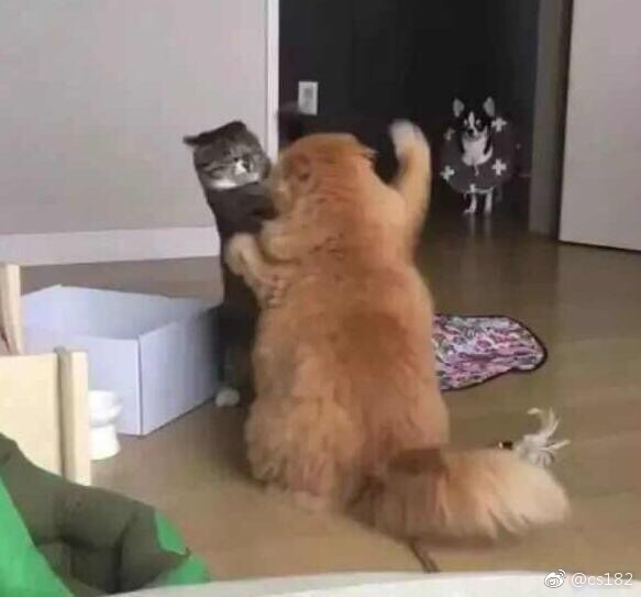 因为争夺纸箱,两只体型差距较大的猫发生了肢体冲突,在外玩耍回家的狗子看到后不知所措。
